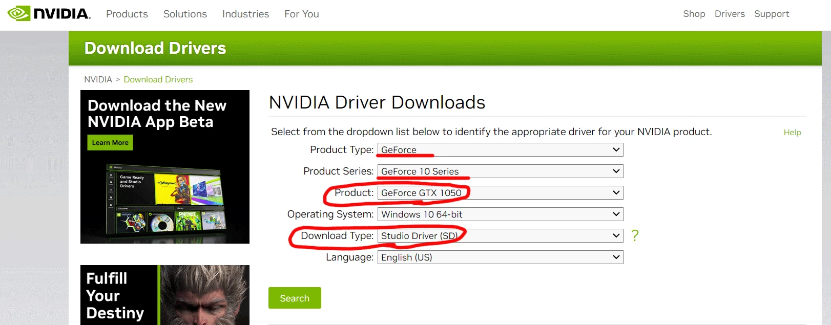 adobeサポートが案内してるリンク先(https://www.nvidia.com/Download/index.aspx?lang=jp)