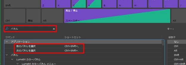 ショートカットキーについて。ソースモニタ、プログラムモニター、タイムライン、プロジェクトパネルを順番に切り替えたい。