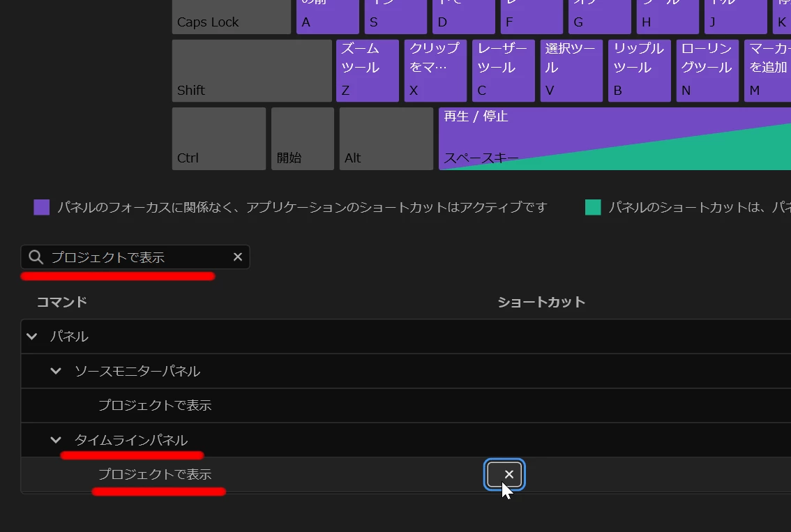 ショートカットの名前が「プロジェクトで表示」となっているようなので、検索窓「プロジェクトで表示」と入れていただき、「タイムラインパネル」の「プロジェクトで表示」に適当なキーを割り当てていただくとうまくゆくのではないかなと思います。