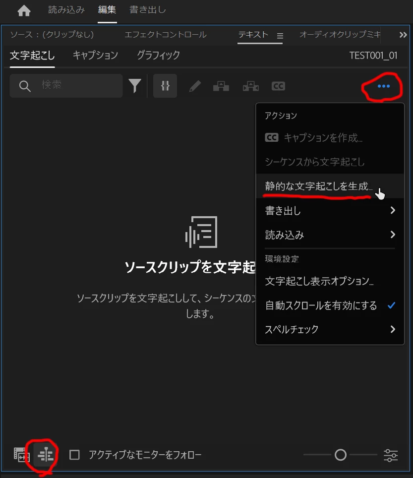 希望としてはシークエンス内で、イン・アウトを打って、そこだけ文字起こししたいのですが、テキストの文字起こしのタブを開くと「ソースクリップを文字起こし」しか選択できず、これを行うとおそらくクリップすべて(?)の文字起こしが行われてしまうという状況です。