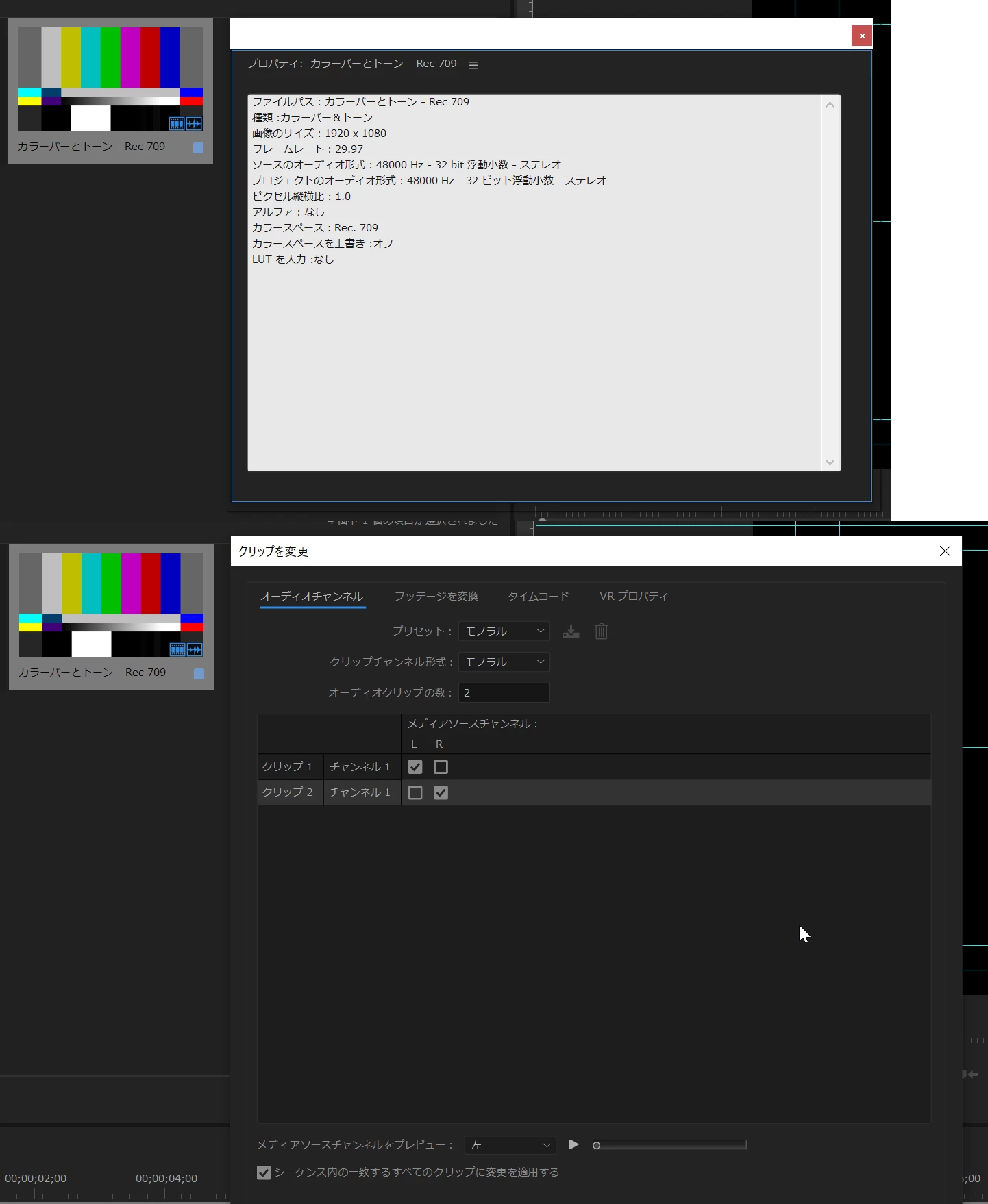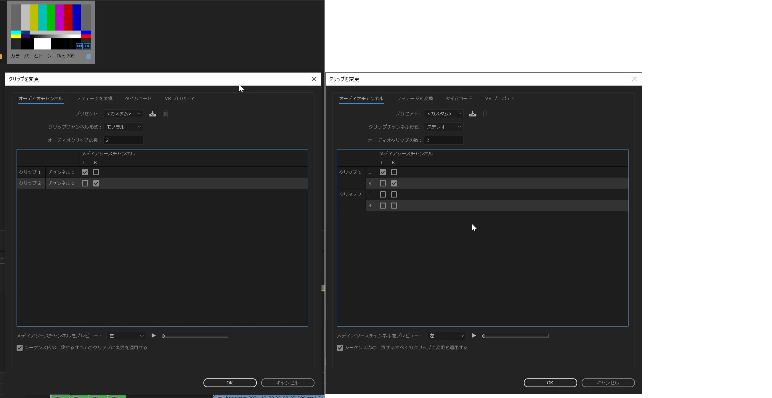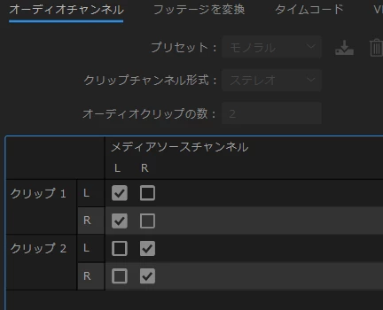 3. オーディオクリップの数が2、クリップ1のLチェック、クリップ2のRにチェック を確認する