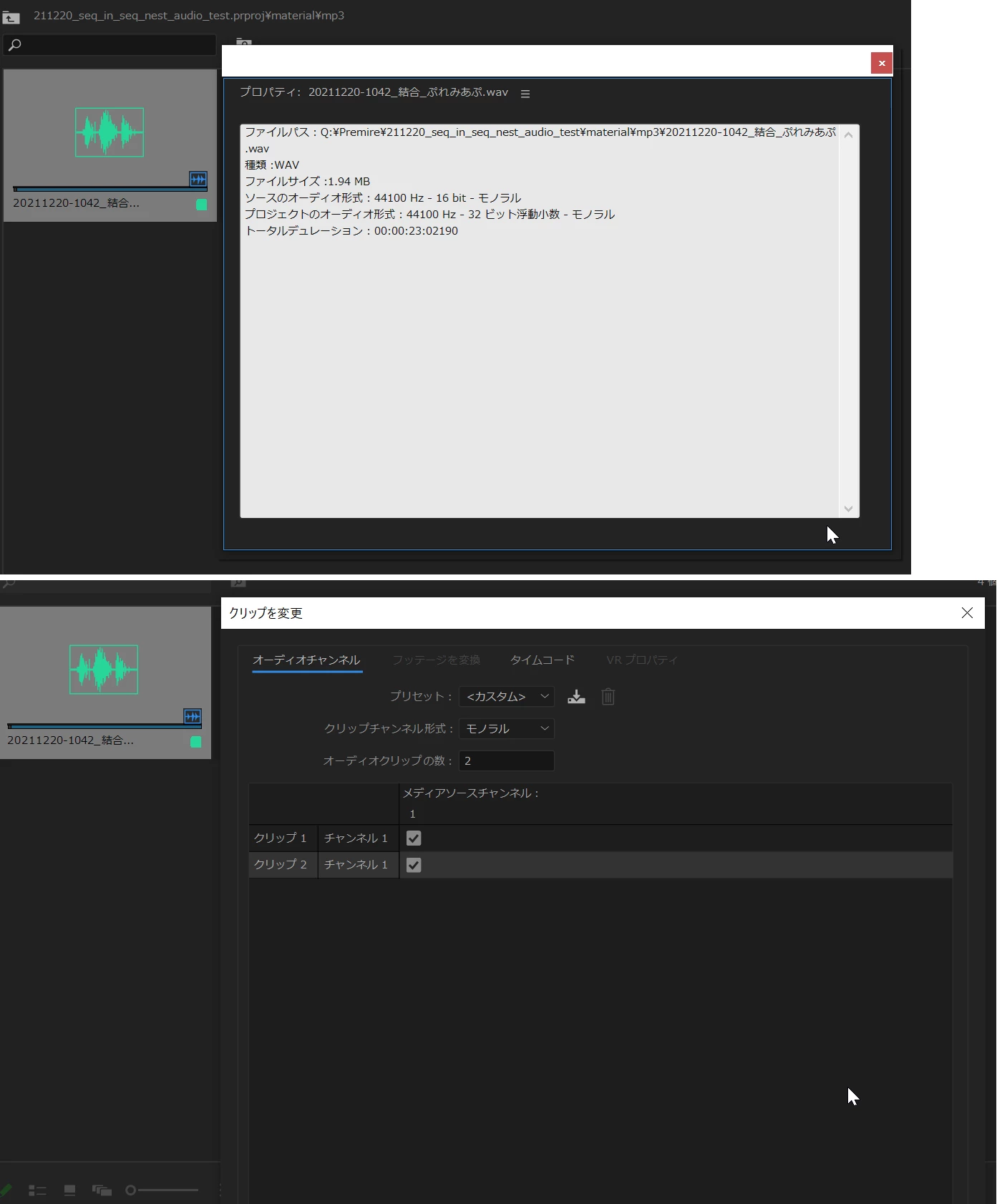 シーケンスをネストするときには、シーケンスのクリップチャンネル形式をモノラル、オーディオクリップの数を2に設定する必要がありそうです。