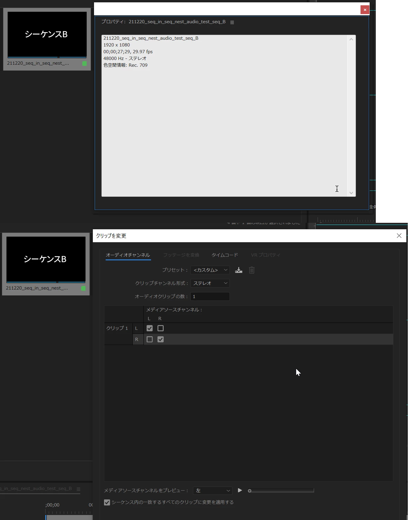 (おそらく、先ほど添付していただいた動画のシーケンスBにAをのせる際、オーディオチャンネルを変更なさっていると思いますので、同様に変更してください)