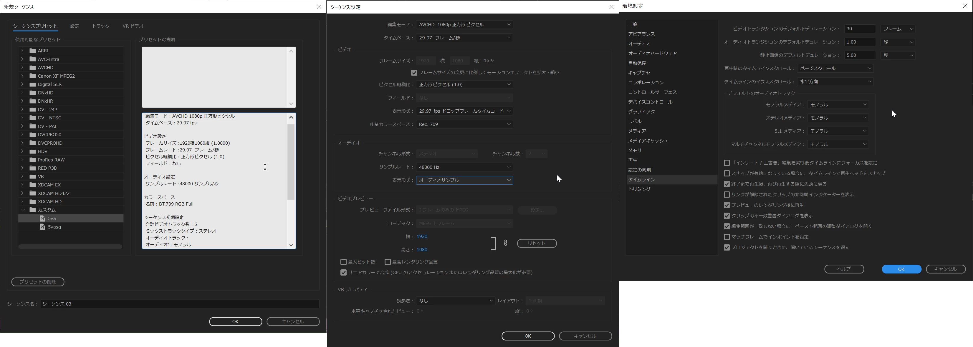 同様に新規シーケンス作成時にはクリップチャンネル形式がステレオ、オーディオクリップの数が1★になっています。