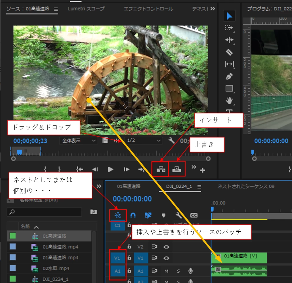「ネストとしてまたは個別のクリップとして・・・」アイコンをオン(青色)、「挿入や上書きを行うソースのパッチ」の「V1」と「A1」をオン(青色)にして、「ソースモニター」から「ビデオトラック」へドラッグ&ドロップしてみたらいかがでしょうか。