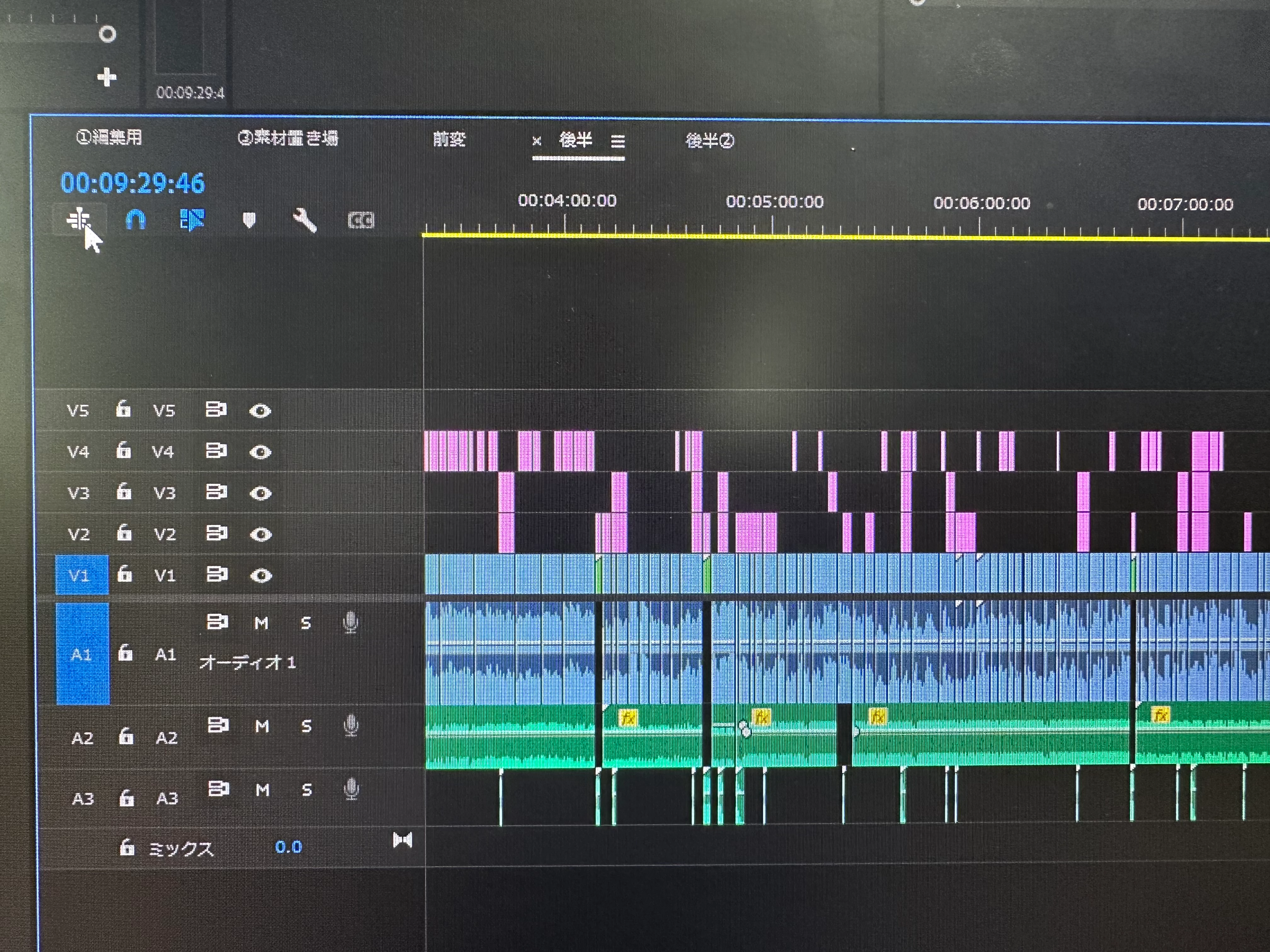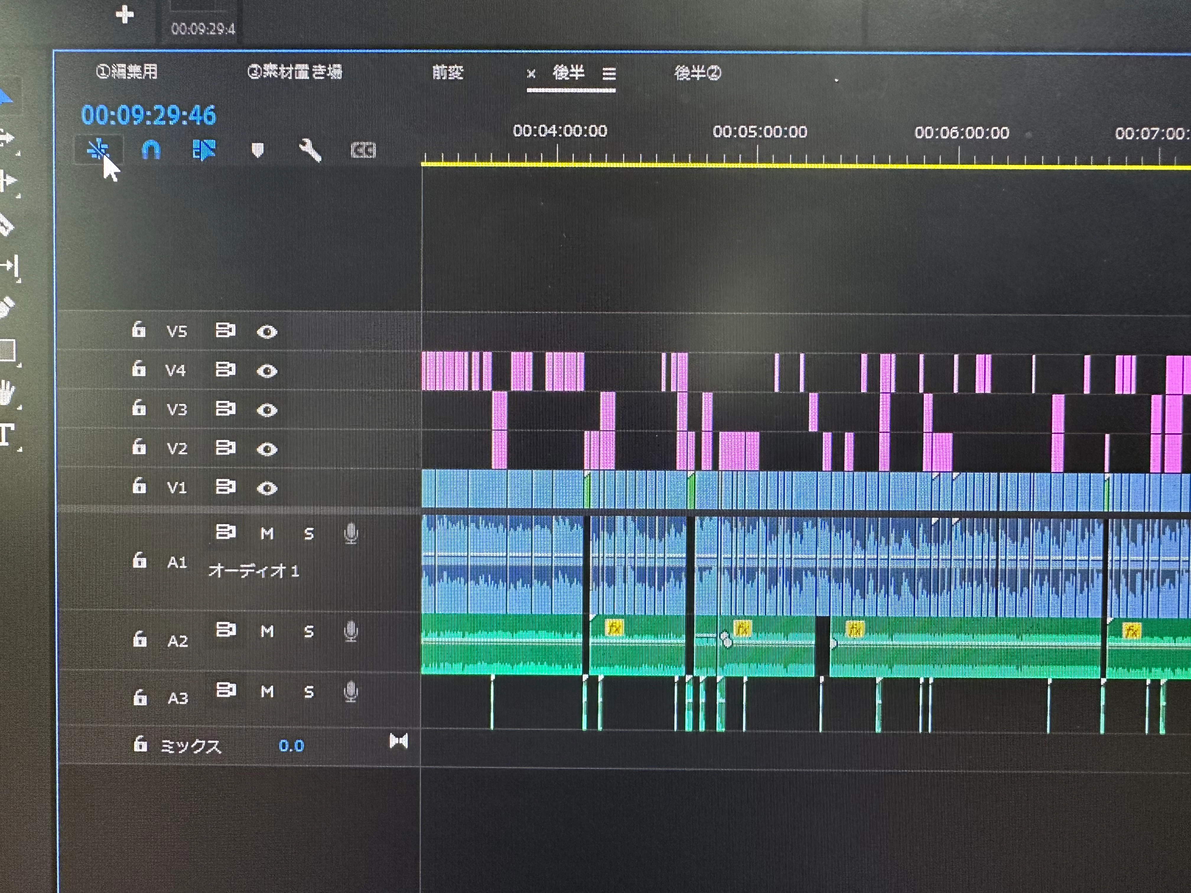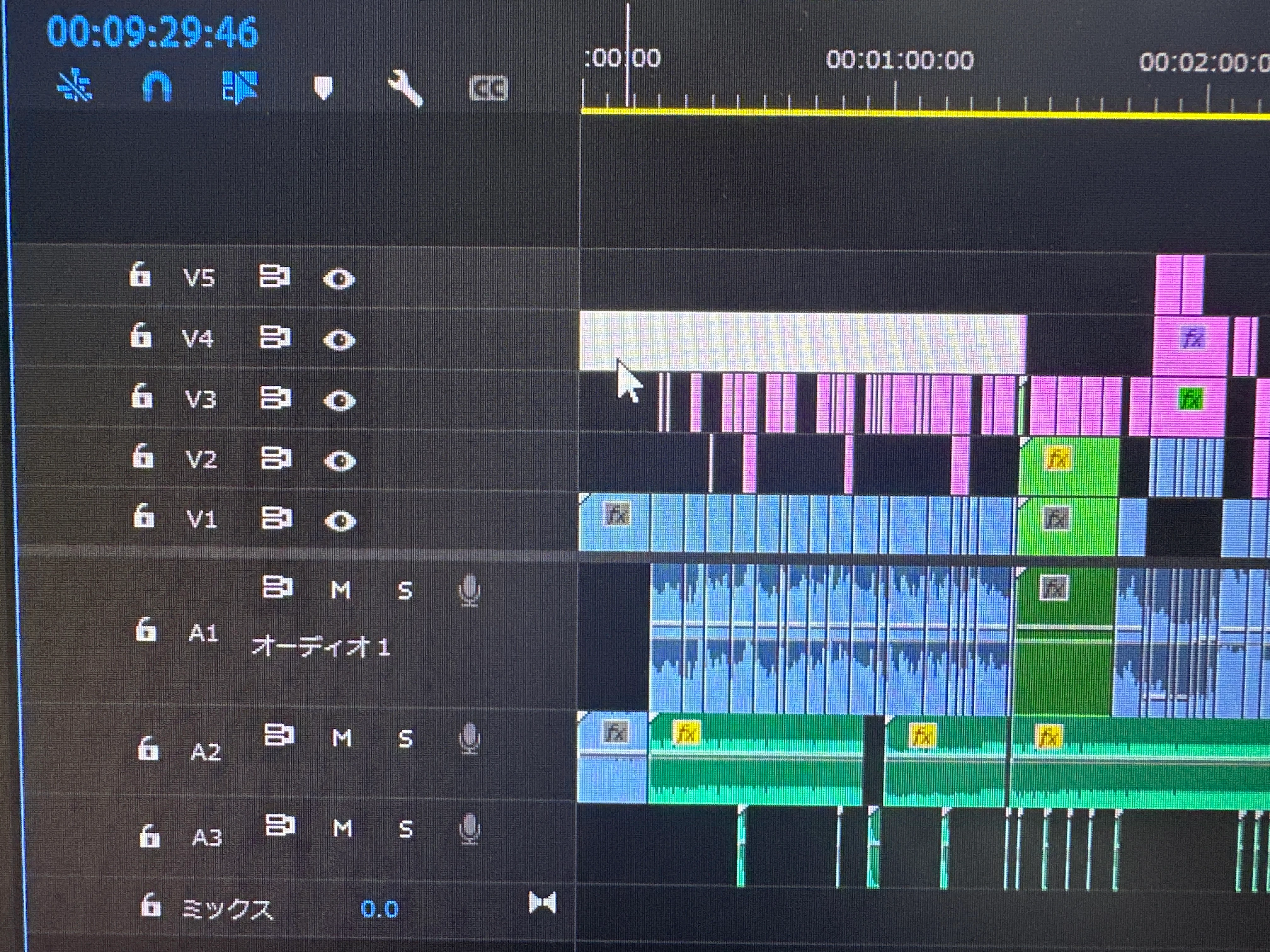 ※タイムラインの一番左のV1、A1のボタンが光らないし選択も出来ない。