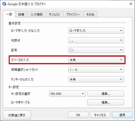 画像は私が使用しているGoogle IMEの例ですがお使いのIMEでの変更を実施してくださいー。