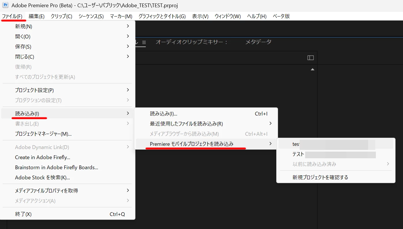 ベータ版をインストールしていただき、ファイルメニューの「読み込み」から「Premiere モバイルプロジェクトを読み込み」を選ぶ流れです。