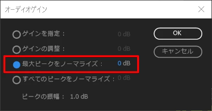 予めどの程度大きくしたらよいかわかっている場合には「ゲインを指定」で決め打ちでも良いと思いますが、後処理でコンプなど使わない場合にはノーマライズの方が都合が良いかもしれません。