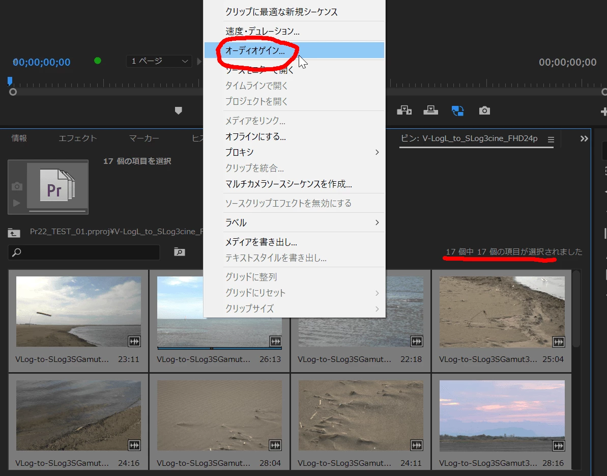 プロジェクトパネルにて音を大きくしたい素材を全選択して、右クリック→「オーディオゲイン」から、タイムラインにのせる前でもまとめて設定できます。