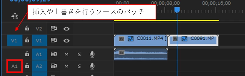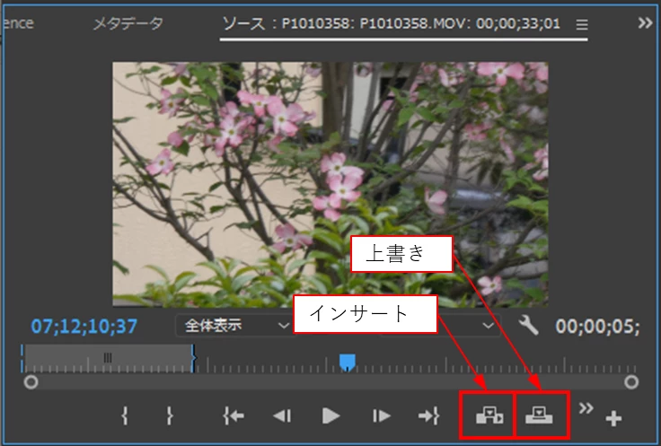 また、このアイコンは、「ソース」パネルからアセットを「タイムライン」パネルの挿入先トラックを指定して「インサート」や「上書き」を行う場合に使用します。