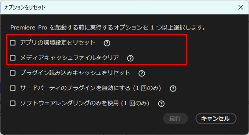 ※上記でうまくいかない場合は、「オプションをリセット」ウィンドウで「メディアキャッシュファイルをクリア」にチェックを入れ再度試してみてください。