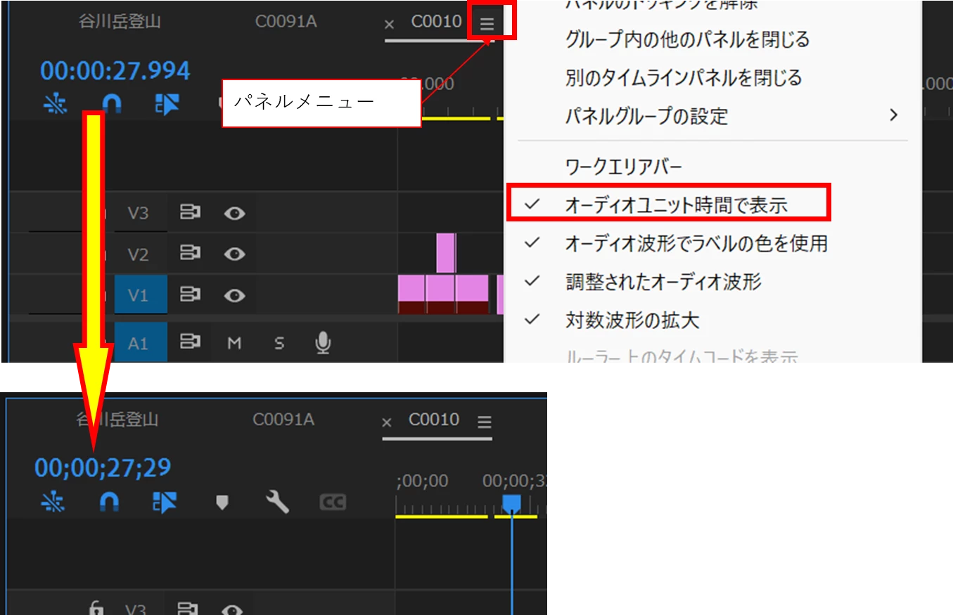 というわけで、仕方なくオーディオの表示を「ミリ秒」にして、「オーディオユニット時間」表示にすることで実際の時間を確認しながら作業する、といったことを行なっていました。