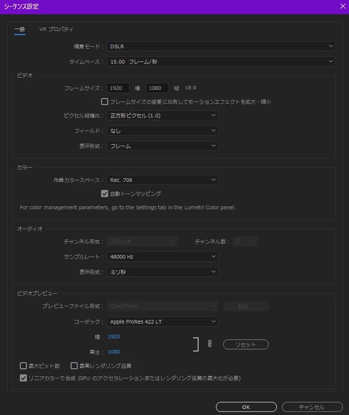 ・15.00fpsのクリップを用いて、「クリップに最適なシーケンス」を作成すると、タイムベース15.00fpsのシーケンスが作成され、タイムコードの表示形式は「30 fpsタイムコード」に設定されるものの、実際には15 fpsタイムコードで表示され、何ら問題なく動作します。