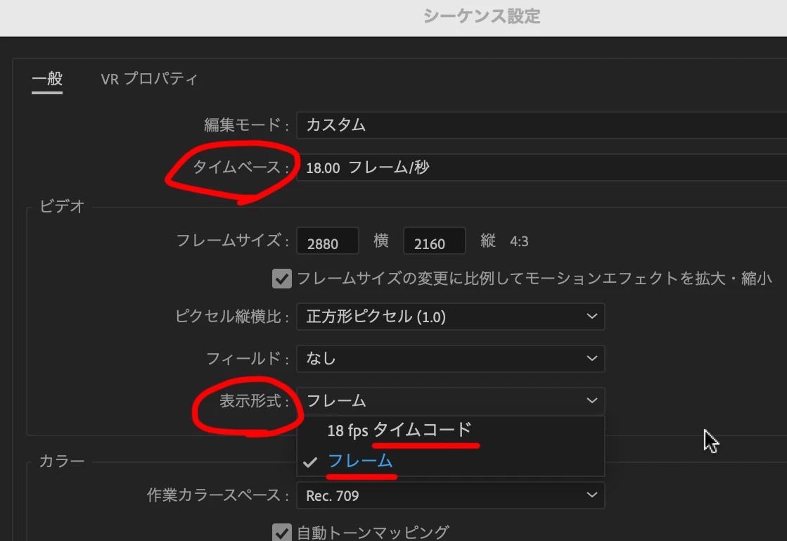 ・シーケンス設定で表示形式の部分をクリックするなどしてOKを押下すると、「30 fpsタイムコード」でカウントが進捗し、それ以降は実時間の半分の時間で表示されてしまう。