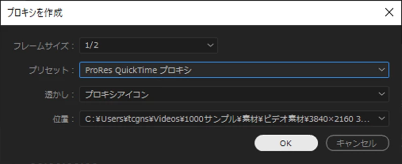 位置は、プロキシファイルの保存フォルダーです。作業前に作成しておくと良いです。