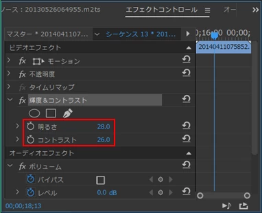 ②そのクリップを選択したまま、「エフェクトコントロール」パネルの「輝度&コントラスト」項の「明るさ」と「コントラスト」(下図赤枠部)の数値を上げると明るくなります。両者ほぼ同じくらいの数値に上げると良いと思います。気に入った数値にしてみてください。