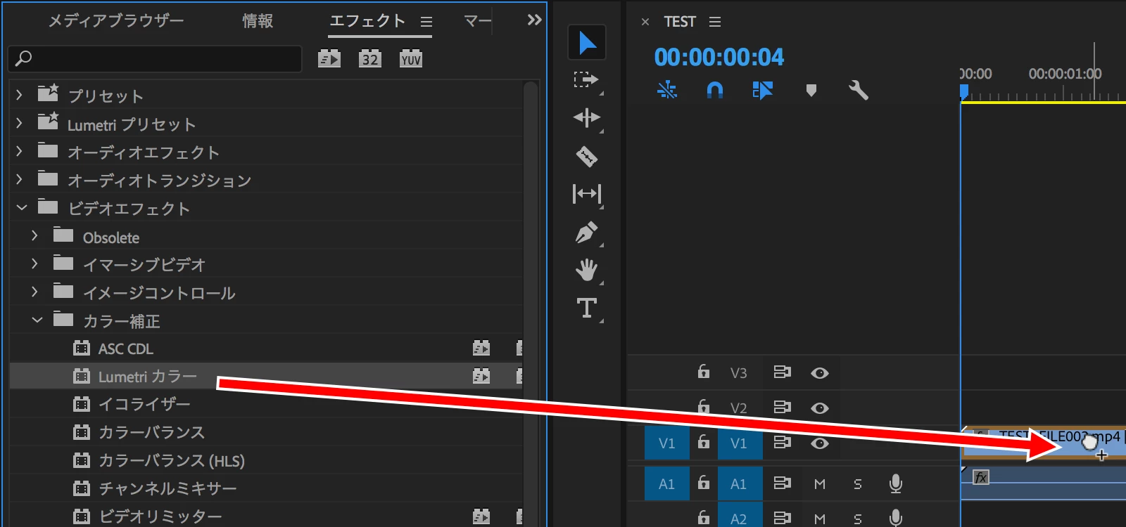 いくつかやり方がありますが、まずエフェクトをドラッグ&ドロップでタイムラインのクリップに適用します。