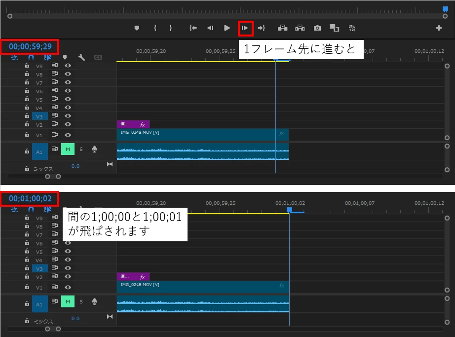ちなみにこの「ドロップ」や「ノンドロップ」は、あくまでも時間のカウントの仕方の違いなので、「映像がコマ落ちする」といったように映像自体に影響することはありません。