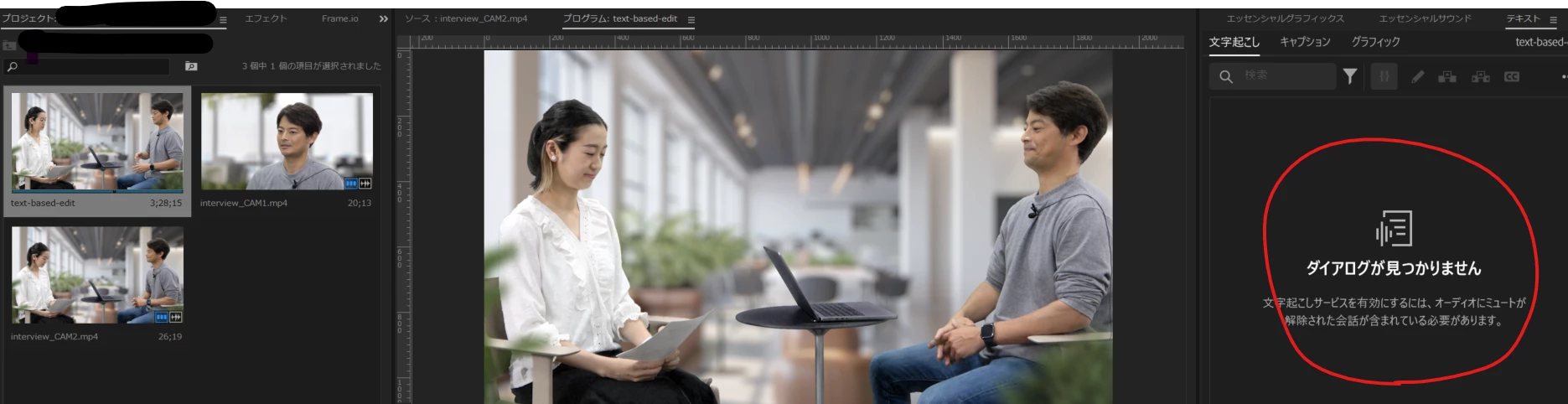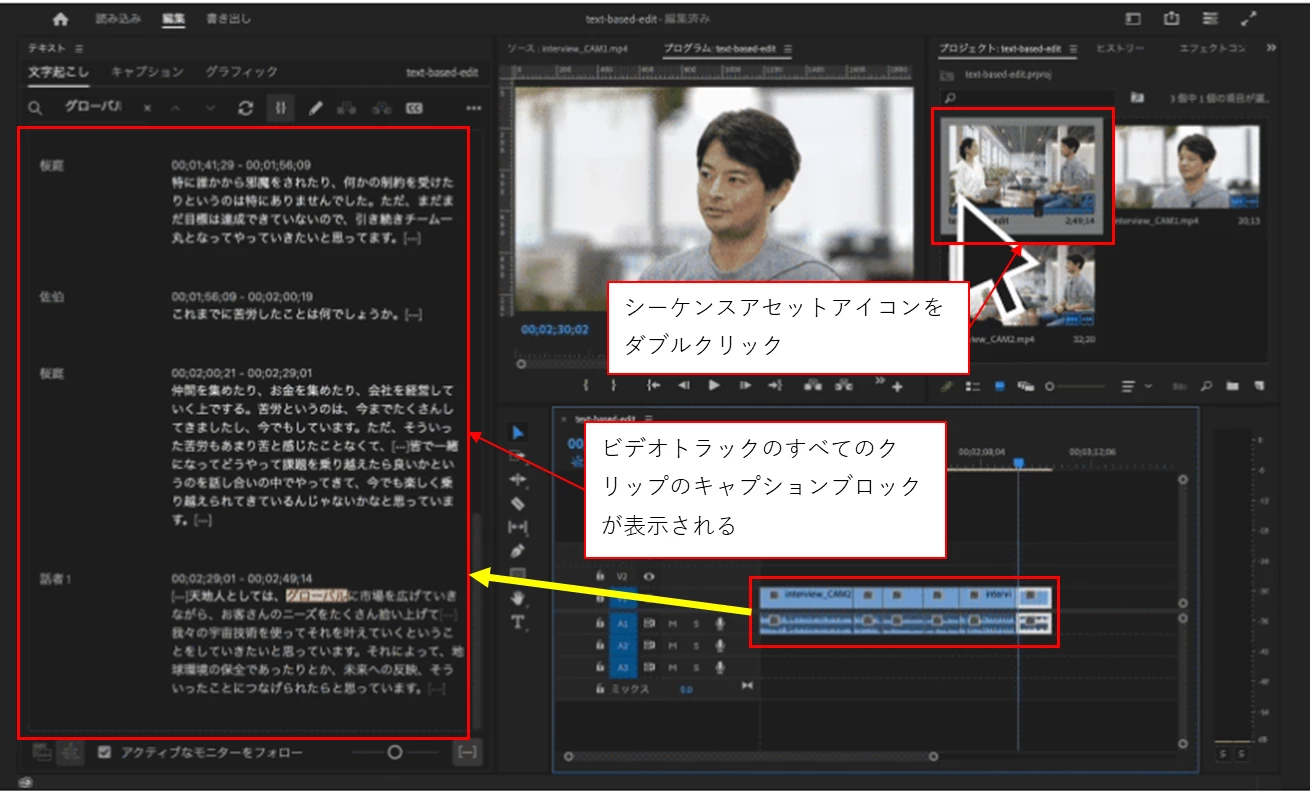 プロジェクトパネルでシーケンス「text-based-edit」をダブルクリックしてアクティブにします。