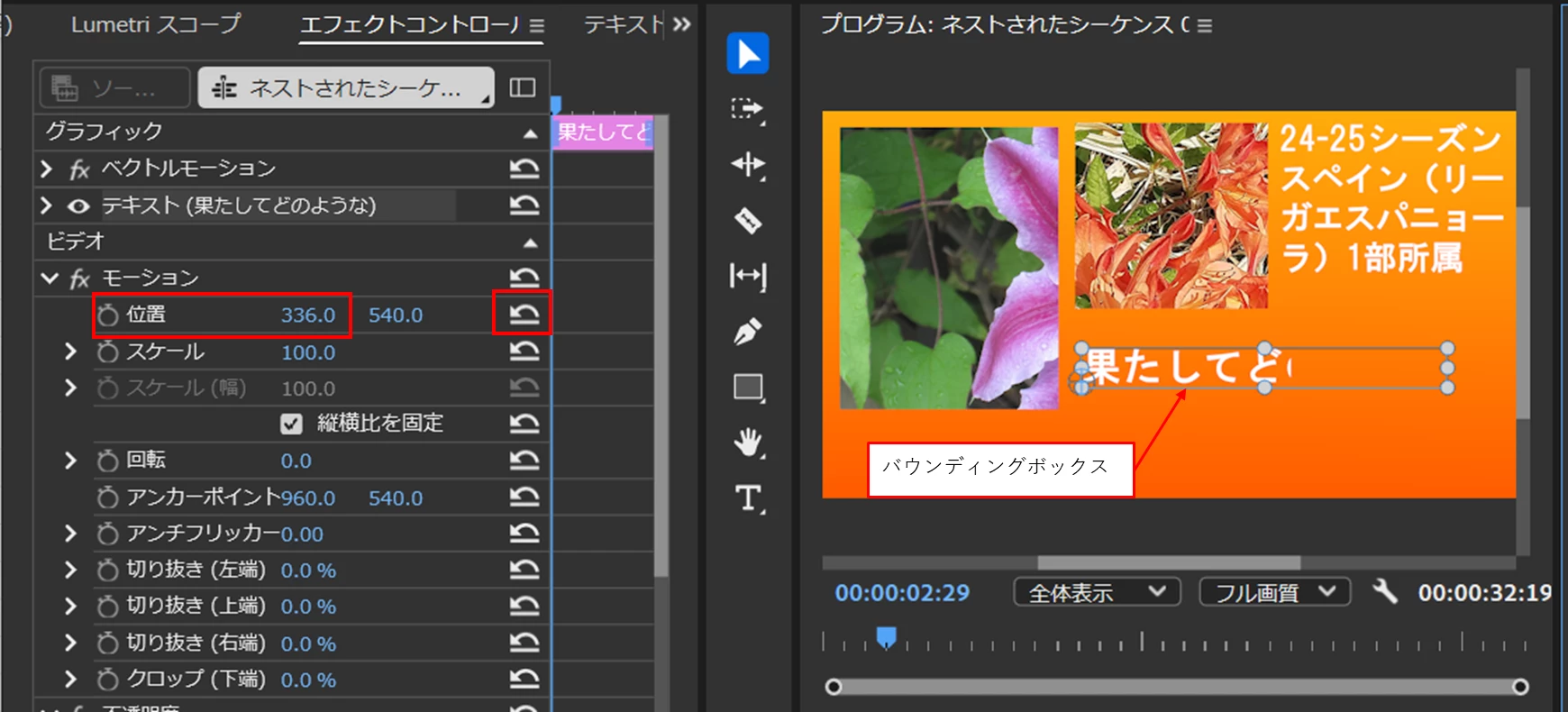 その場合は、右側の「左向き半円矢印」をクリックし、数値を初期設定値(960.0,540.0)にリセットします。すると、テキストは右側にずれますので、青いバウンディングボックス内部をドラッグして正しい位置へ移動します。
