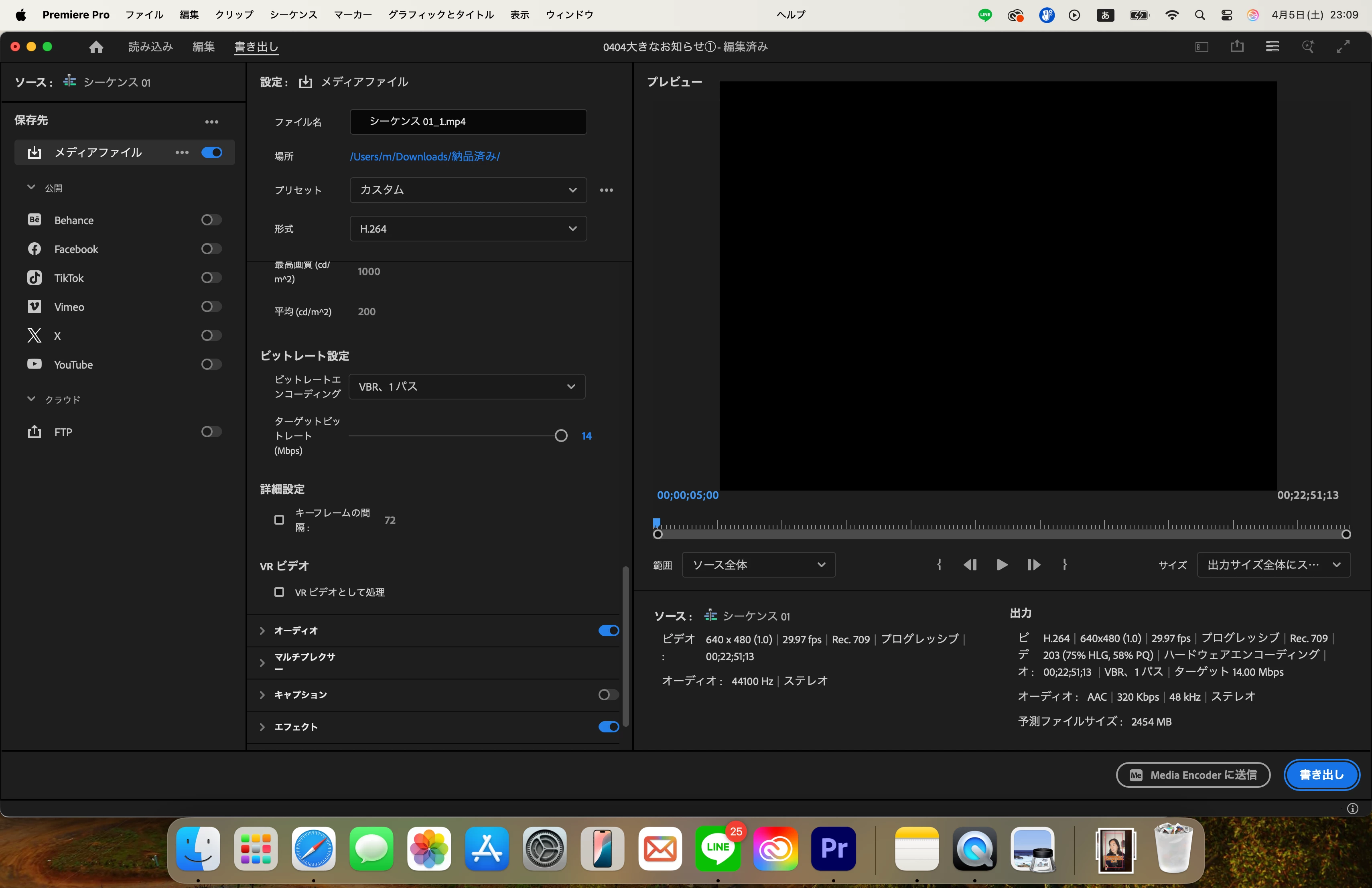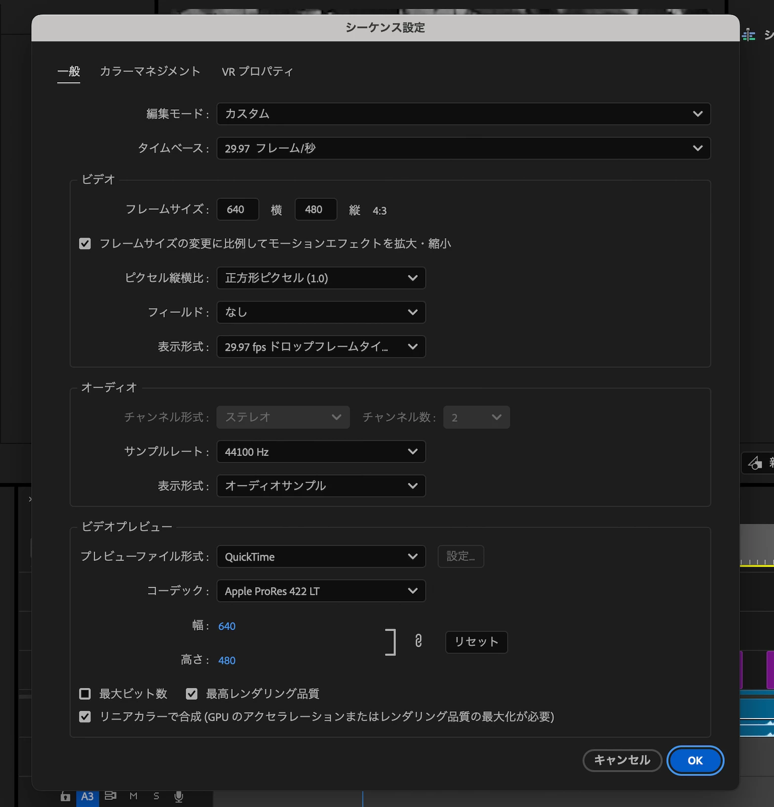 急ぎとのことですので、添付していただいた画像から分かる問題かもしれない点を挙げて見ますと、まずシーケンス設定のフレームサイズが「640×480」という小さなサイズであるところが気になります。