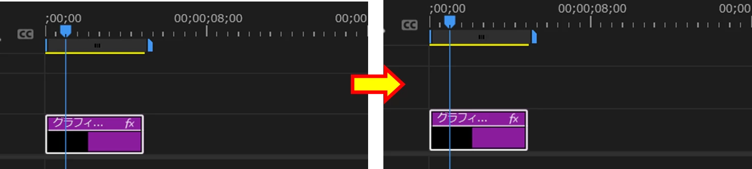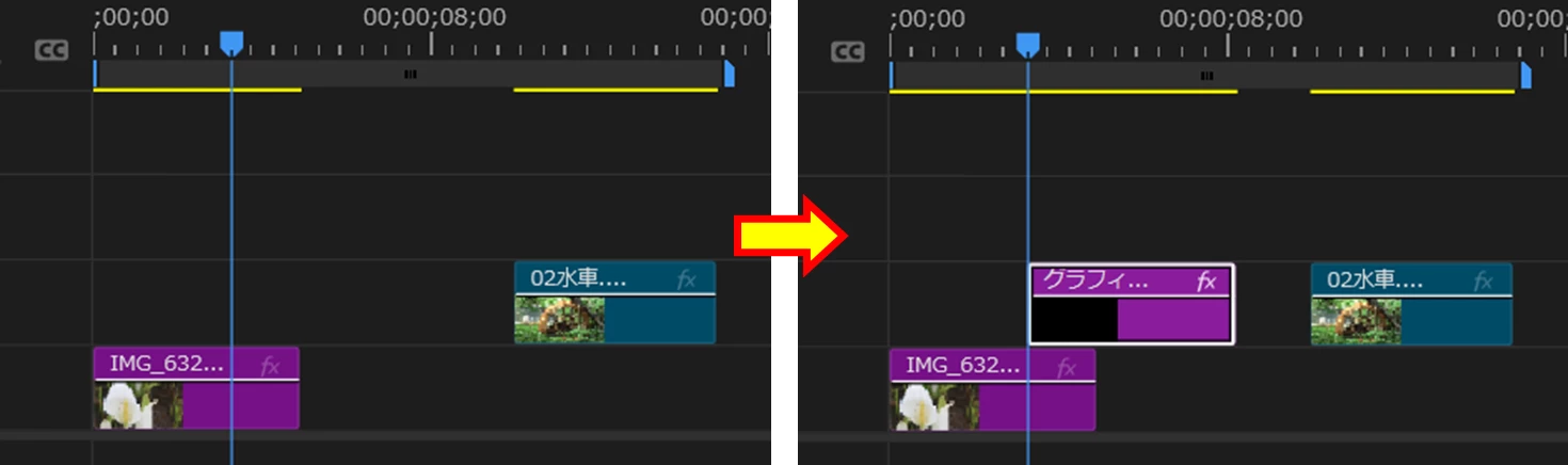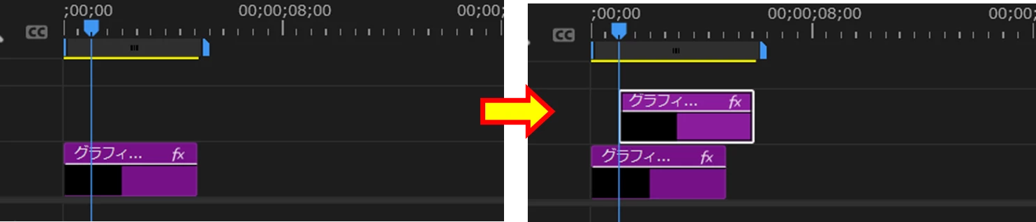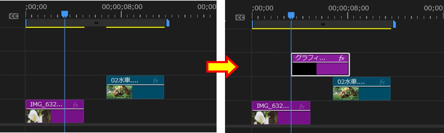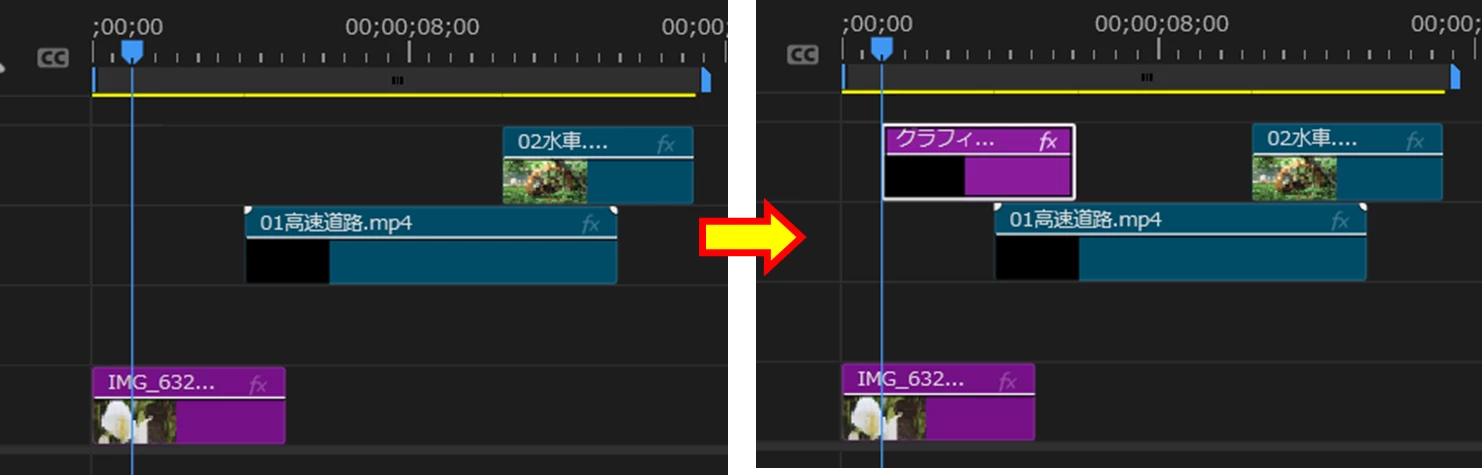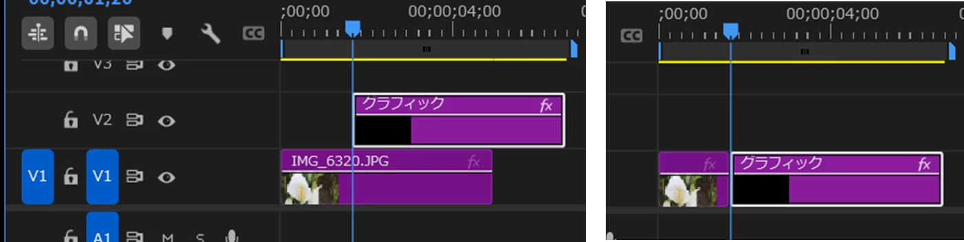 通常なら、V2トラックの再生ヘッド位置からクリップが配置されるのですが(下左図)、V1トラックに再生ヘッド位置から上書きされるということでしょうか(下右図)。