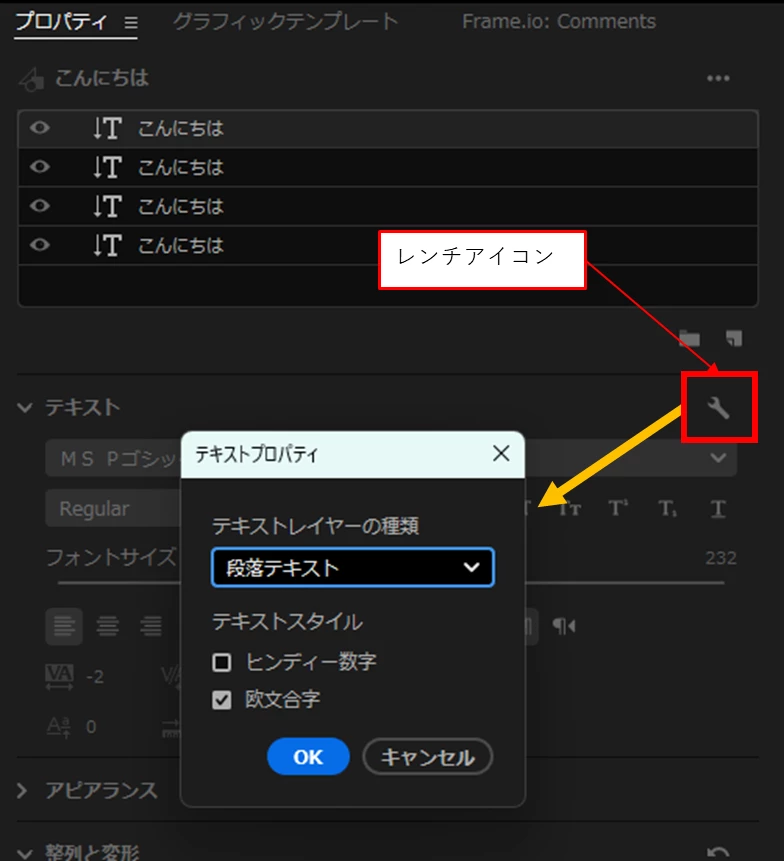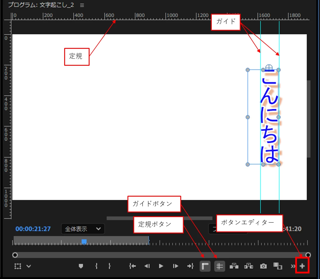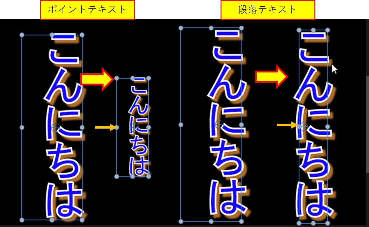 また、ポイントテキスト、段落テキストとも、Ctrlを押してドラックする方法、レンチアイコンから「プロクラムモニターをスナップイン」を選択する方法とも、アンカーポイントは中心に吸い付くようになりました。