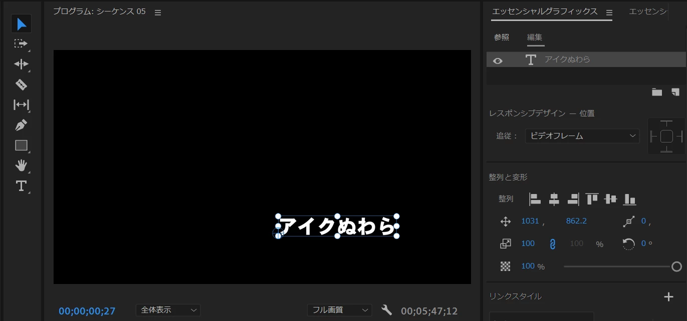 すると、「エッセンシャルグラフィックス」パネルの「参照」タブを開くと先ほどの「モーショングラフィックステンプレート」が表示されています。