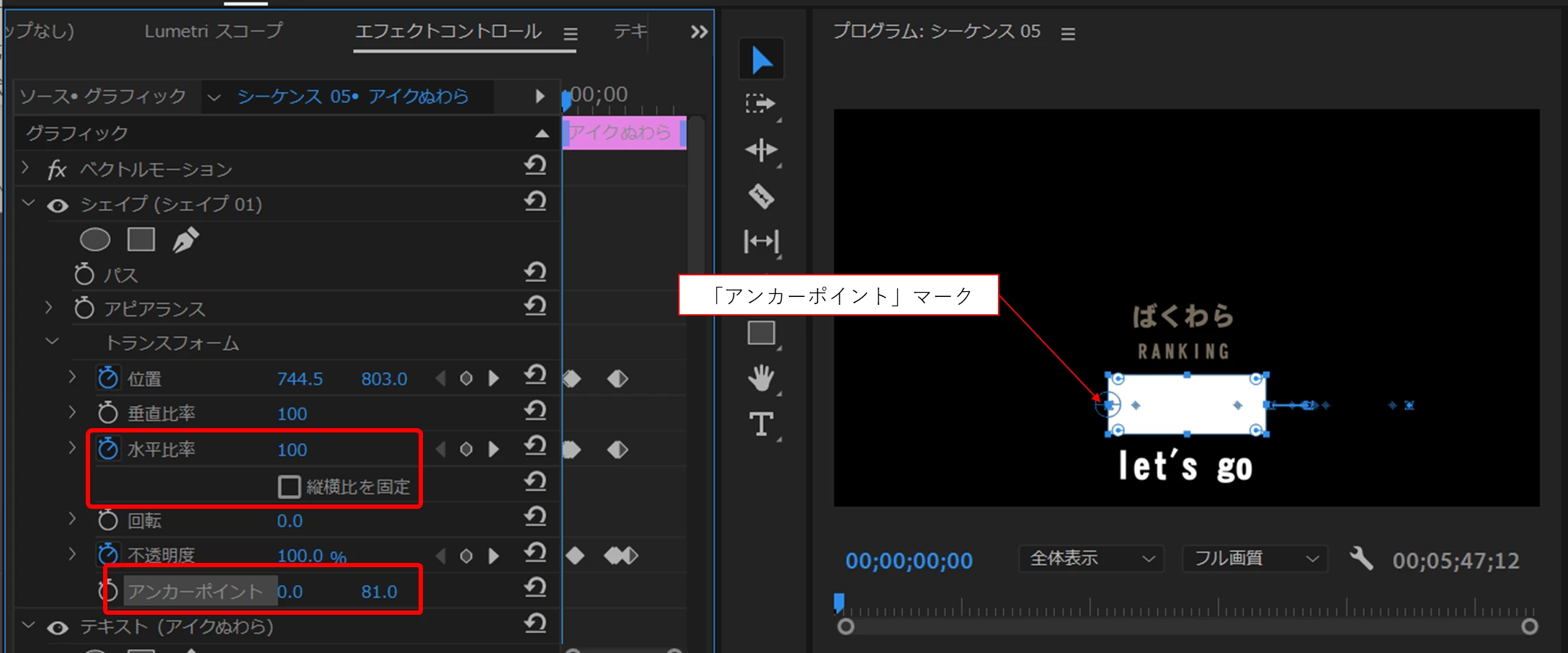 シェイプの長さ違いは水平比率を変更して対応します。「縦横比の固定」のチェックを外すと、「水平比率が」表示され長さを変更できます。また「エフェクトコントロール」パネルで「アンカーポイント」を選択すると、「プログラムモニター」に「アンカーポイント」マークが表示されますので、ドラッグしてシェイプの左辺上に移動します。これで左辺を基準に長さが変わります。