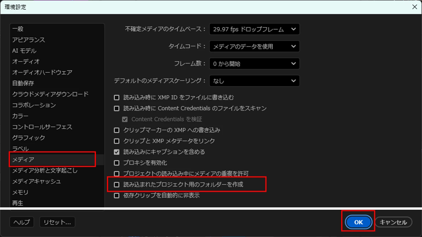 メニューの「編集」⇒「環境設定」⇒「メディア」ペインで「読み込まれたプロジェクト用のフォルダーを作成」にチェックが入っていたら、チェックを外し、最後に「OK」をクリックします。