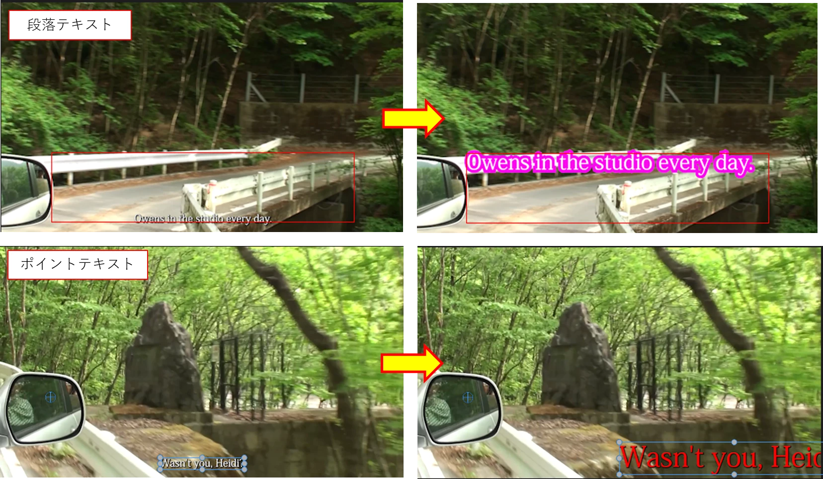 ①「キャプションをグラフィックにアップグレード」した後何も設定を変更していない場合は、「段落テキスト」になっていますので、「ポイントテキスト」に変更します。複数のクリップを選択して行うことができます。