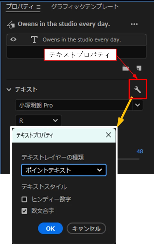「テキストレイヤー」を選択し、「テキスト」項の「テキストプロパティ」アイコンをクリックして「テキストプロパティ」ウィンドウを開き「ポイントテキスト」に設定して「OK」をクリックします。