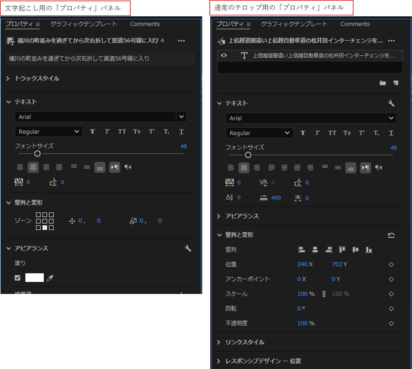推定ですが、文字起こしして作成されたキャプションセグメントクリップを「キャプションをグラフィックにアップグレード」した後、「プロジェクト」パネルのリンクスタイルを適用したらテロップの位置が変わったということでしょうか(下図)。