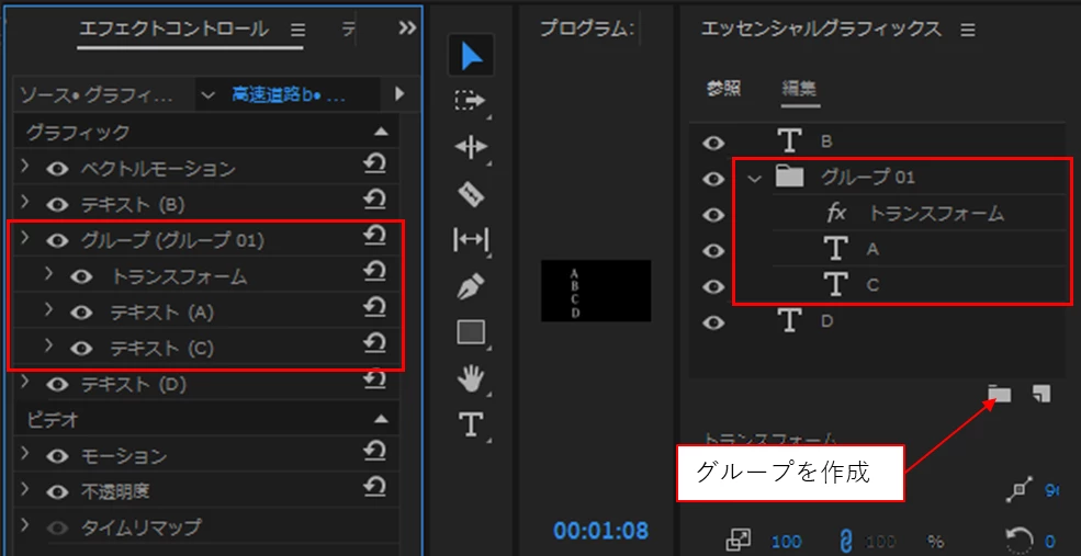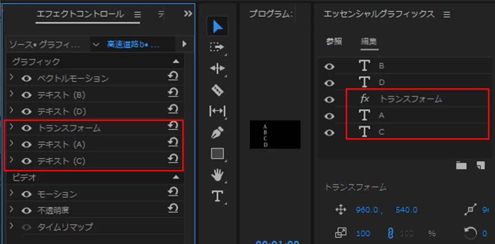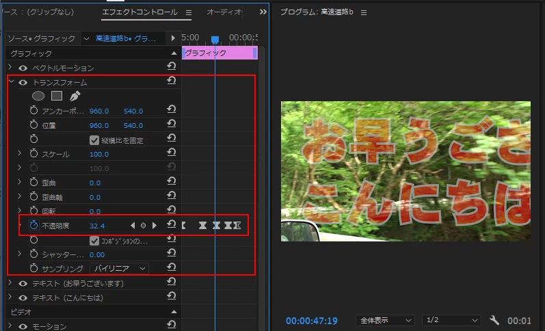 試しに、1つ目のテキストのキーフレームを「カット」にしました。