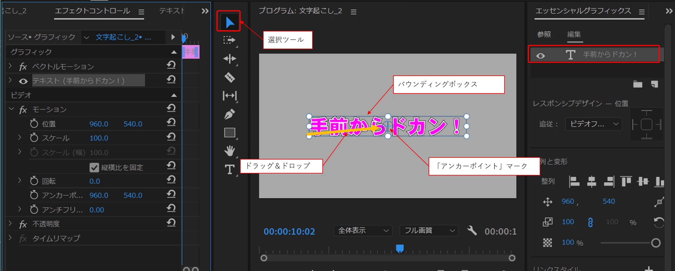 動画の13:30秒からのテロップの動きで、バウンディンブボックスを下に残したまま、テロップが垂直方向に中央揃えになる動きでどのような操作を行ったのか不明ですが、