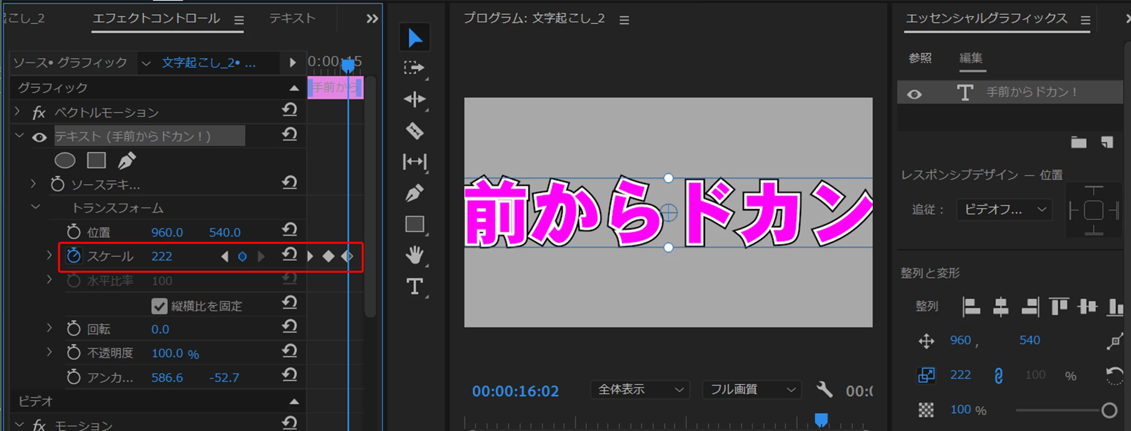 テロップを作成し「水平方向中央揃え」と「垂直方向中央揃え」を適用後、「トランスフォーム」と「オフセット」エフェクトを適用します。「コーナーピン」エフェクトは適用しません。最後に「トランスフォーム」エフェクトの「スケール」にキーフレームを打ちます。