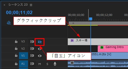②グラフィッククリップが配置してあるビデオトラックの左端にある「目玉」アイコンが押されていませんか。押されていたら再度押して非表示を解除します。