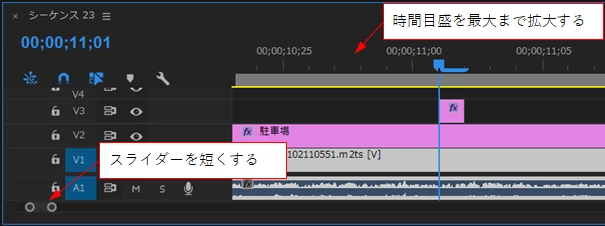 ⇒「V4」トラックが表示されるように「タイムライン」パネルの上下方向を広げてみます。