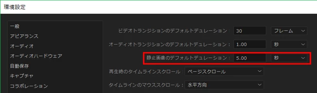 ⇒静止画像の長さの初期設定値が変更されている。