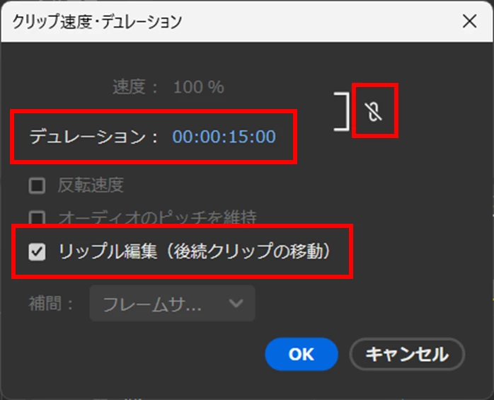 ②メニューの「クリップ」→「速度・デュレーション」を選択し、開いた「速度・デュレーション」ウィンドウで、リンクを解除し、デュレーションに変更後の時間を入力し、「リップル編集(後続クリップの移動)」にチェックを入れて「OK」をクリックします。