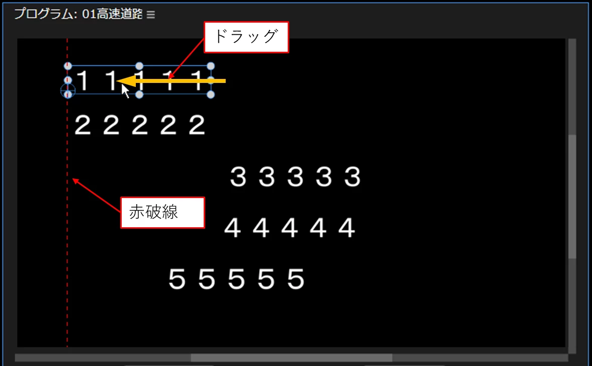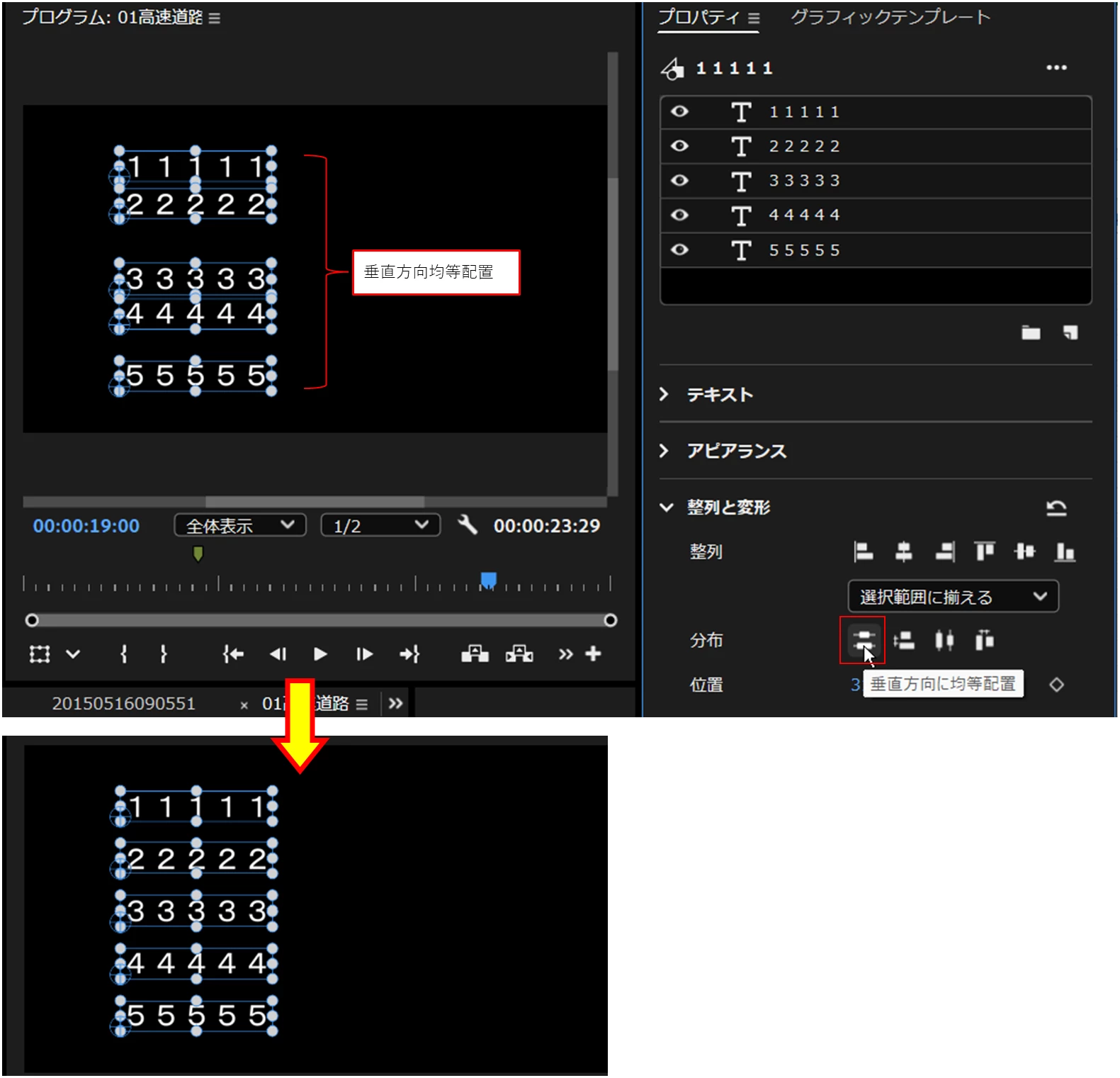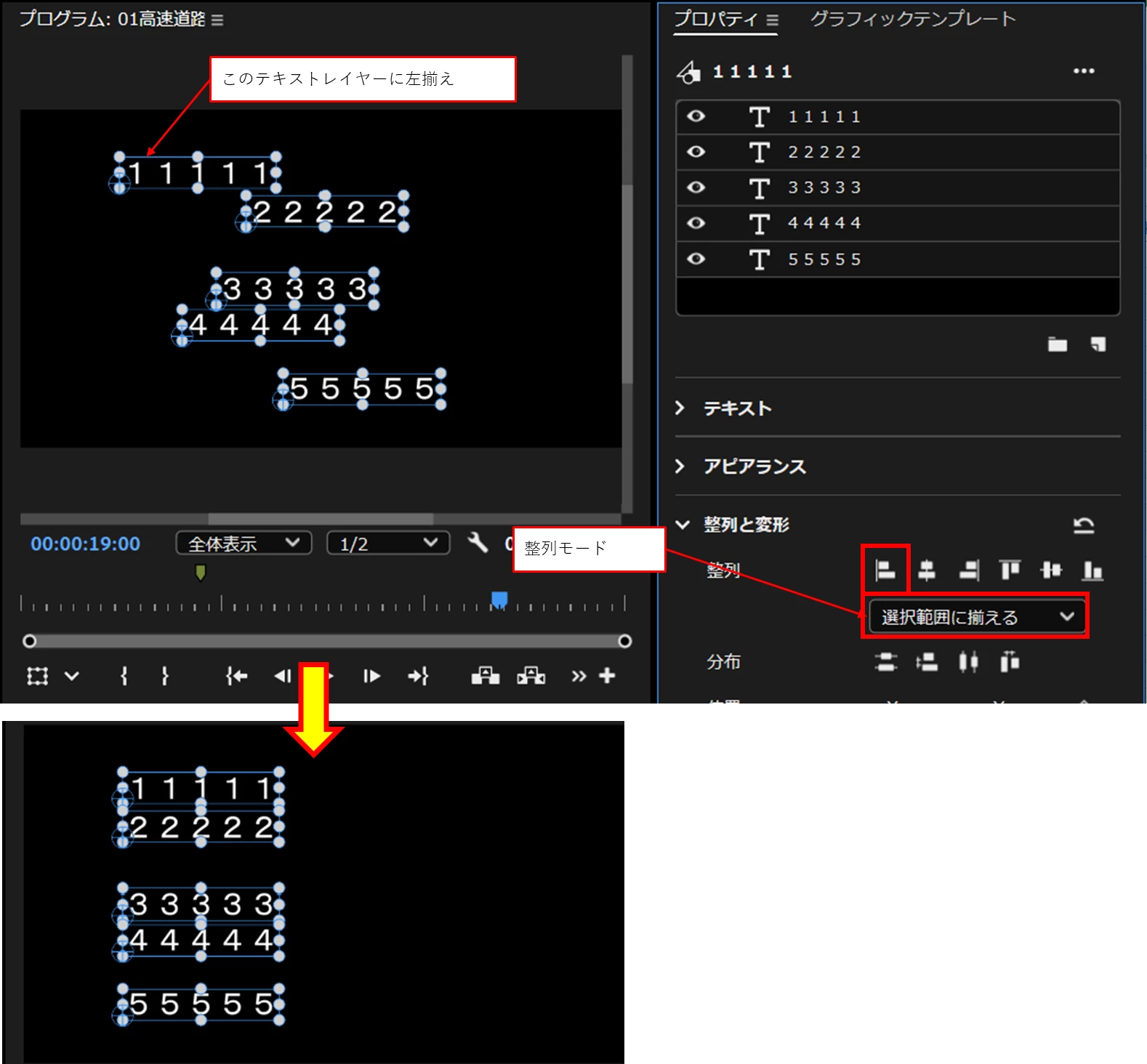 ここでは、5個のテキストレイヤーがあって、その左端のテキストレイヤーに左揃え、垂直方向で均等配置する例です。Premiere Pro v25.0使用。