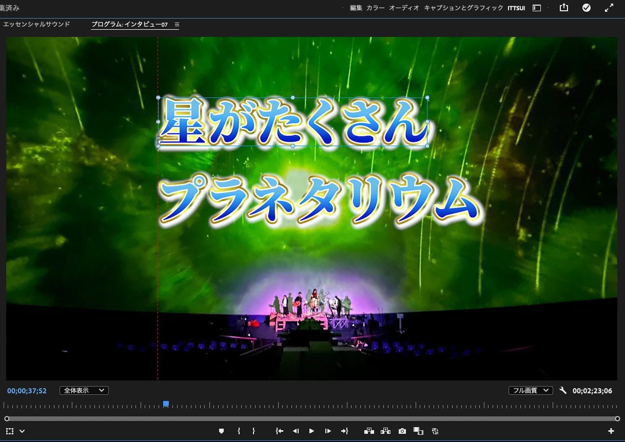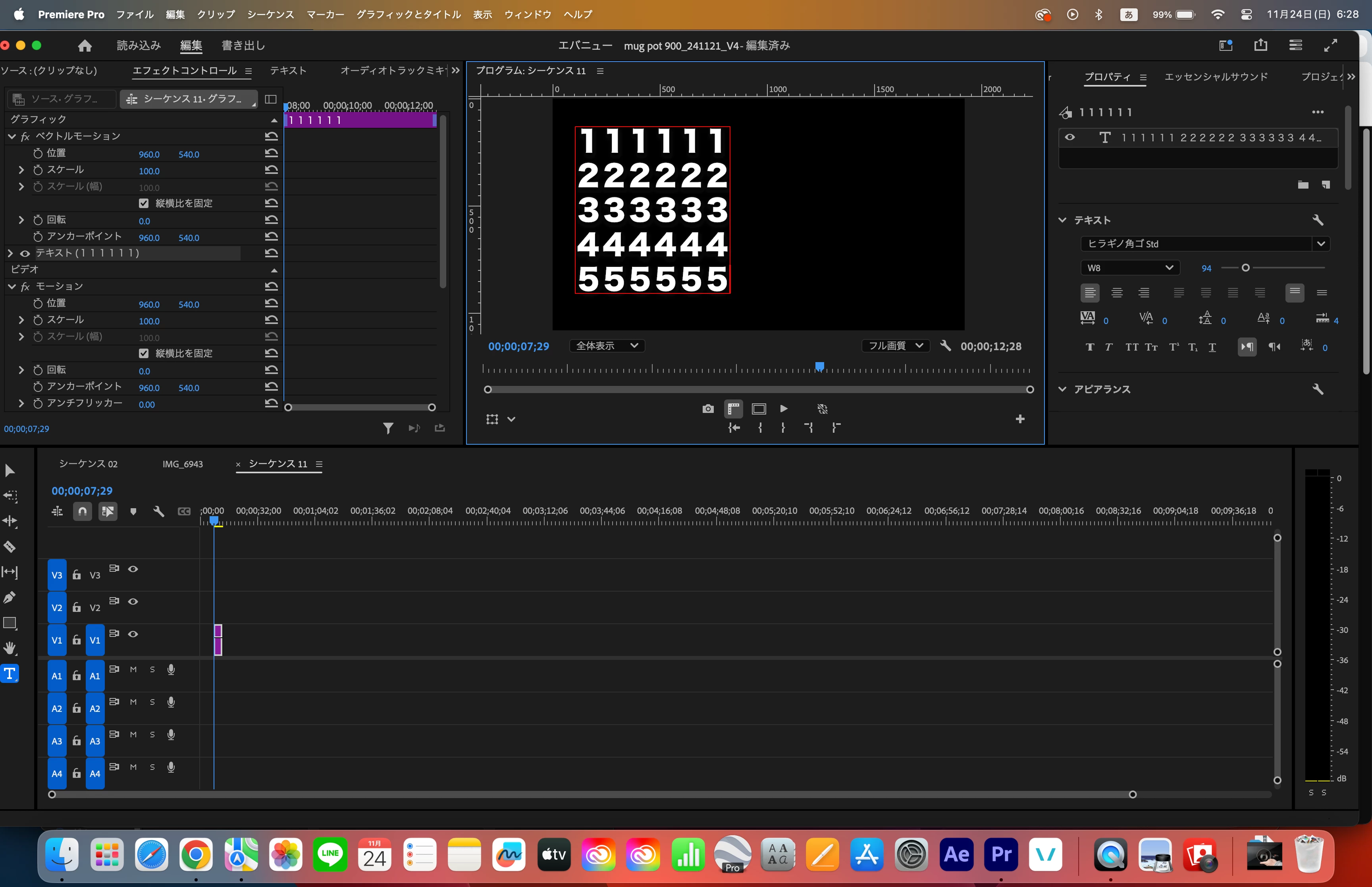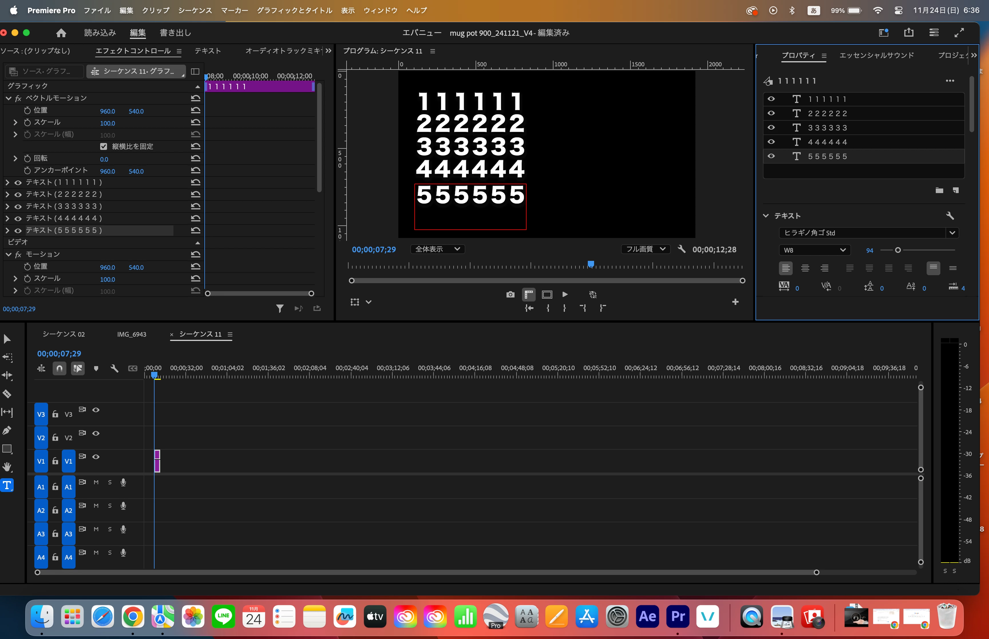 ここでは、5個のテキストレイヤーがあって、その左端のテキストレイヤーに左揃え、垂直方向で均等配置する例です。Premiere Pro v25.0使用。