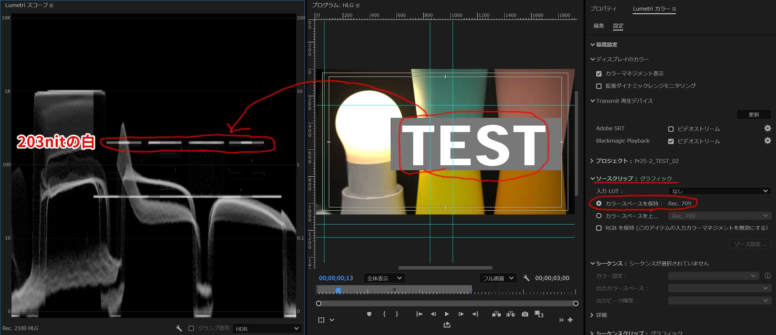 Lumetriスコープで赤く囲った部分が文字の明るさで、白い文字は203nitになります。まぶしい電球型LED照明よりは暗いのですが、SDRでいうところの「白」に相当するレベルとなります。
