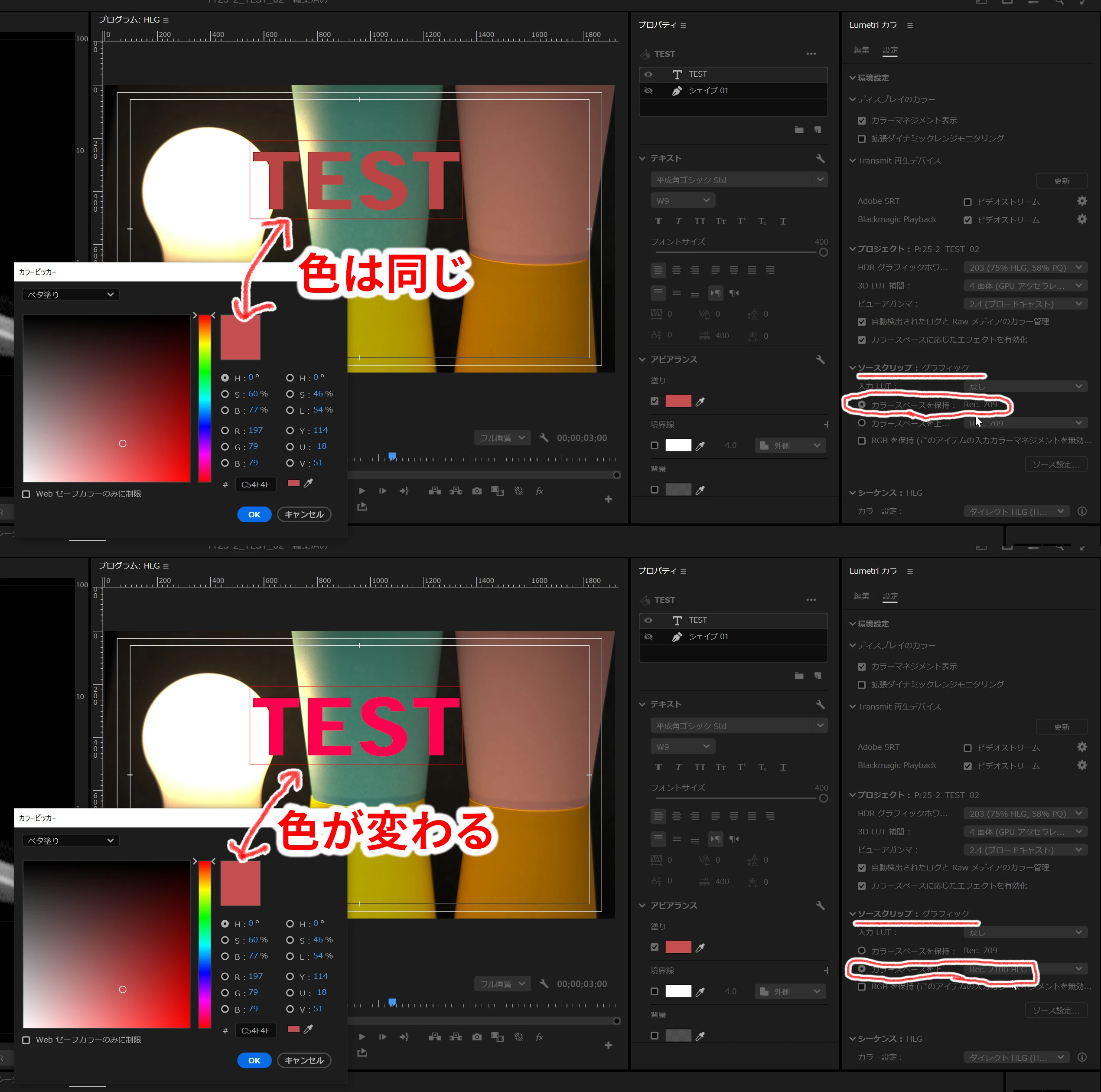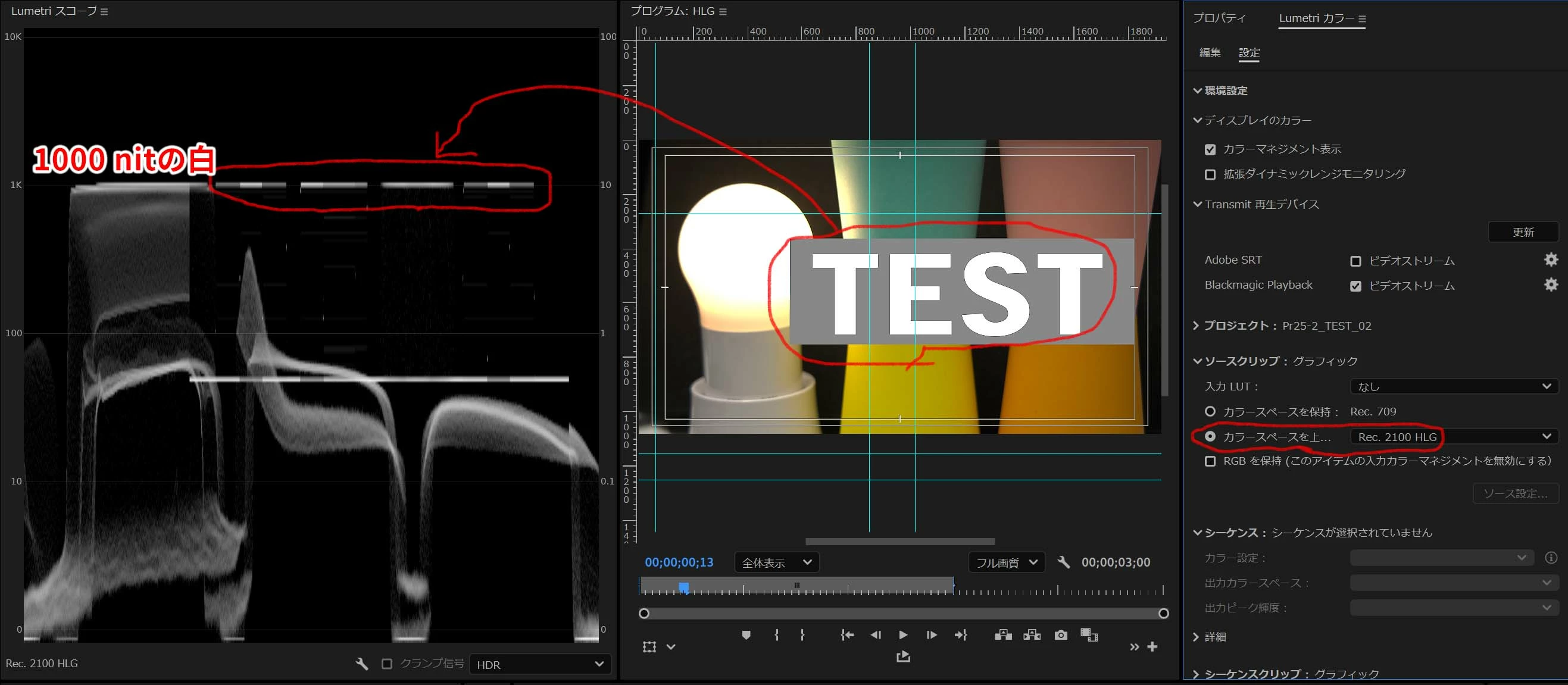 ※シーケンスのカラー設定は「ダイレクト HLG (HDR)」で、電球型LEDが写っている実写映像はSONY製のカメラでRec.2100 HLGで収録した素材です。