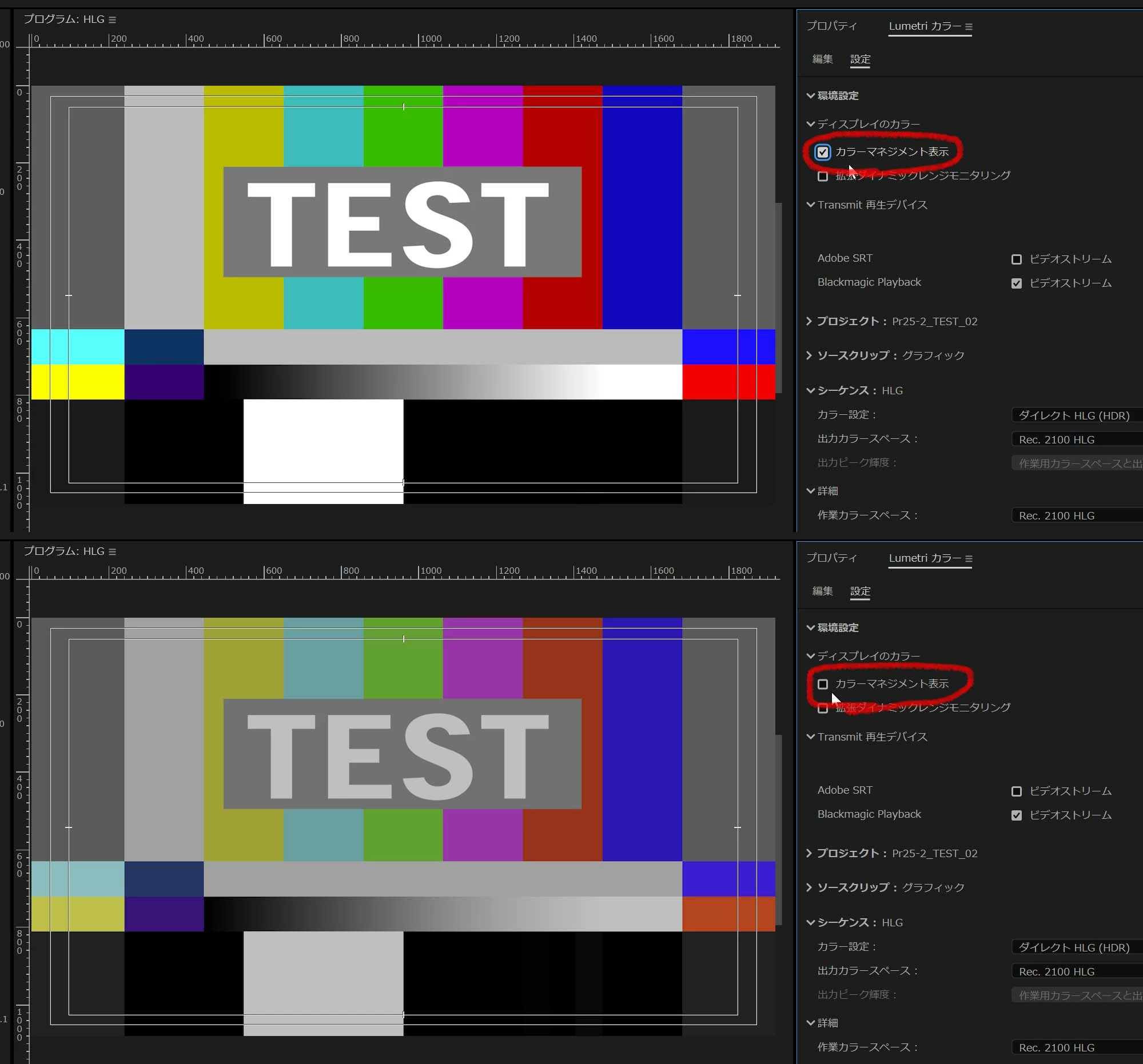カラーバーの色からわかります通り「ディスプレイのカラーマネージメントをON」にしている上段の色味が正しいのですが、ディスプレイのカラーマネージメントをOFFにすると色が薄く柔らかいトーン(HLGは中間より上がログの"ハイブリッドログ"なので……)になってしまいます。
