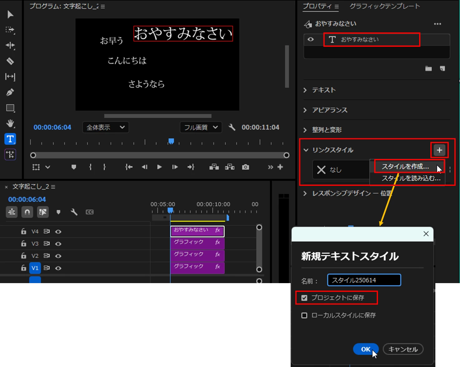 ④開いた「新規テキストスタイル」ウィンドウで「名前を入力し、「プロジェクトに保存」にチェックを入れ、「OK」をクリックします。
