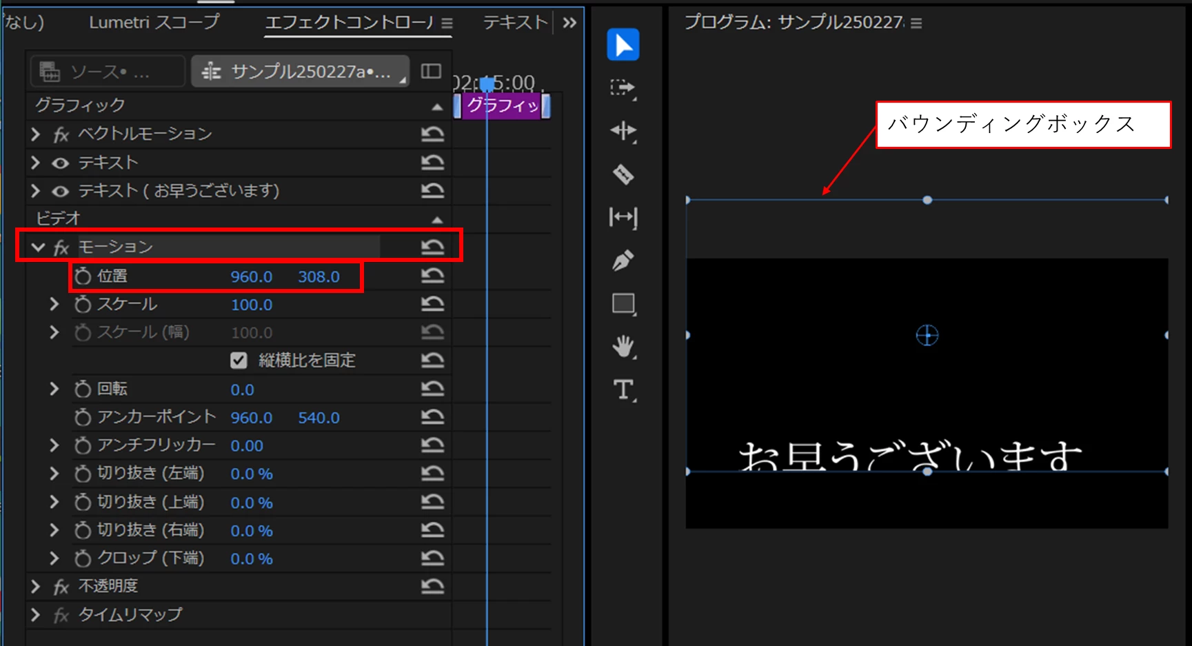 次にテロップの位置を「プロパティ」パネルの「整列と変形」項の「位置」で再度調整します。