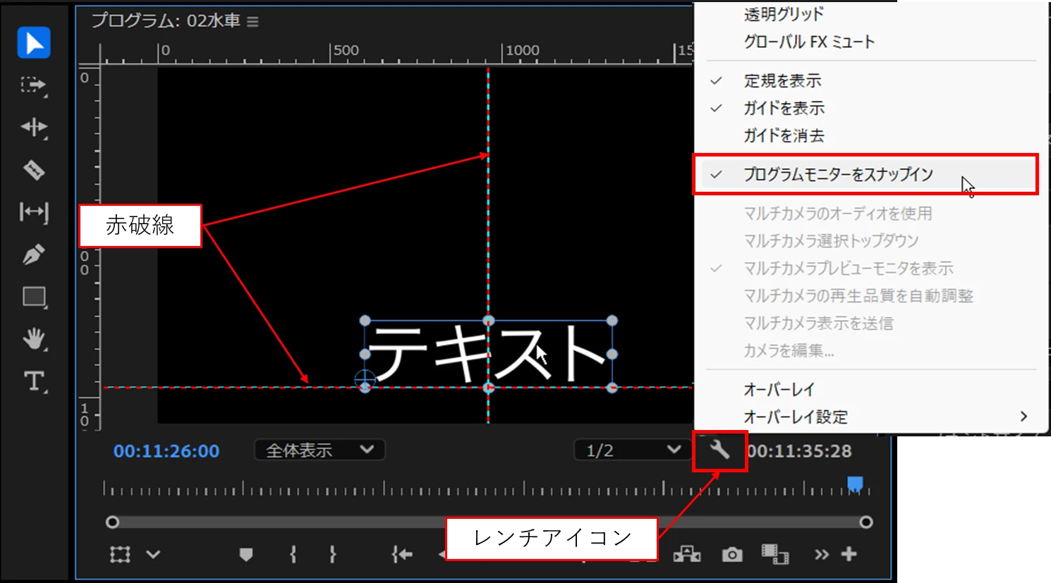 スナップインも使用していますが、フォントや境界線の太さによってはバウンディングボックスがガイドを超えてしまうので、テロップ位置を固定という意味ではあまり意味をなさず…