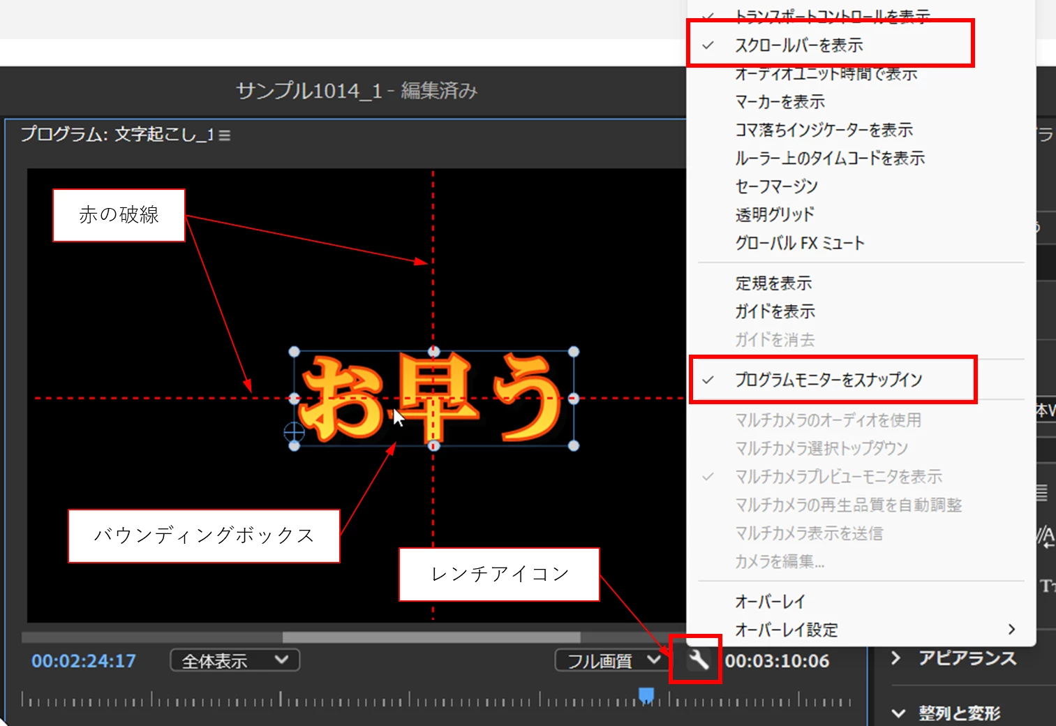「プログラムモニター」の「レンチ」アイコンをクリックして開くメニューから「プログラムモニターをスナップイン」を選択し、テロップのバウンディングボックス内をドラッグして中央付近に移動すると赤の十字破線が表示されて、水平方向と垂直方向が自動的にセンタリングできます。